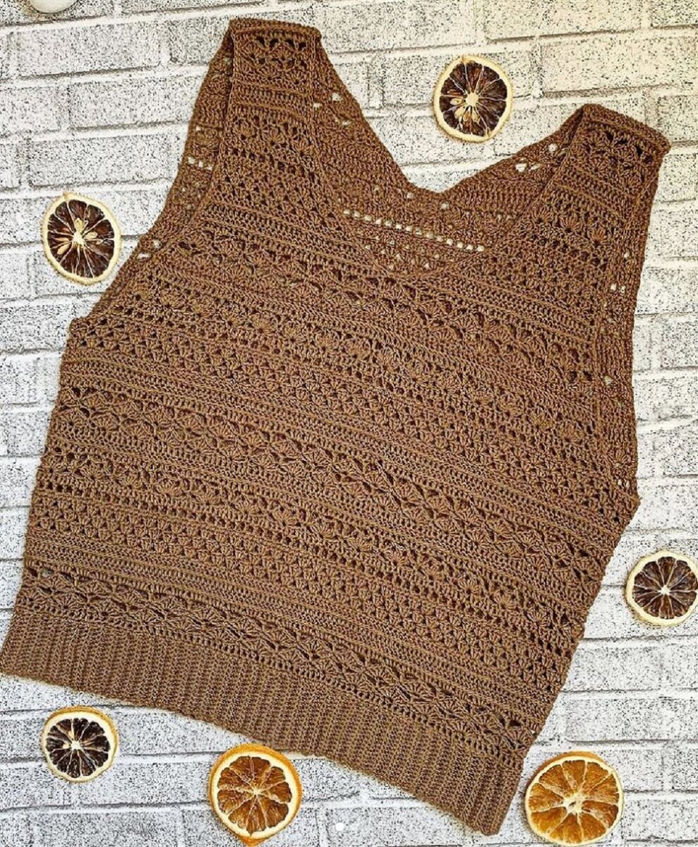 Лаконичный светло-коричневый кроп-топ крючком с разнообразием красивых узоров. Модель прямого кроя, без рукавчиков (но с убавлением под проймы), небольшой круглый вырез горловины. Отделка рельефной резинкой.