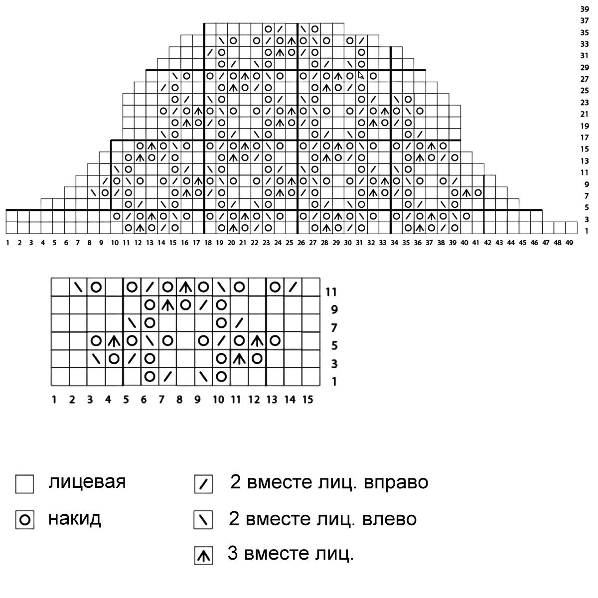 - С 5-го по 9-й ряды: накид, 2 лиц., 2 вместе лиц. с наклоном влево, 1 лиц., 2 вместе лиц. с наклоном вправо, 2 лиц., накид, 1 лиц.