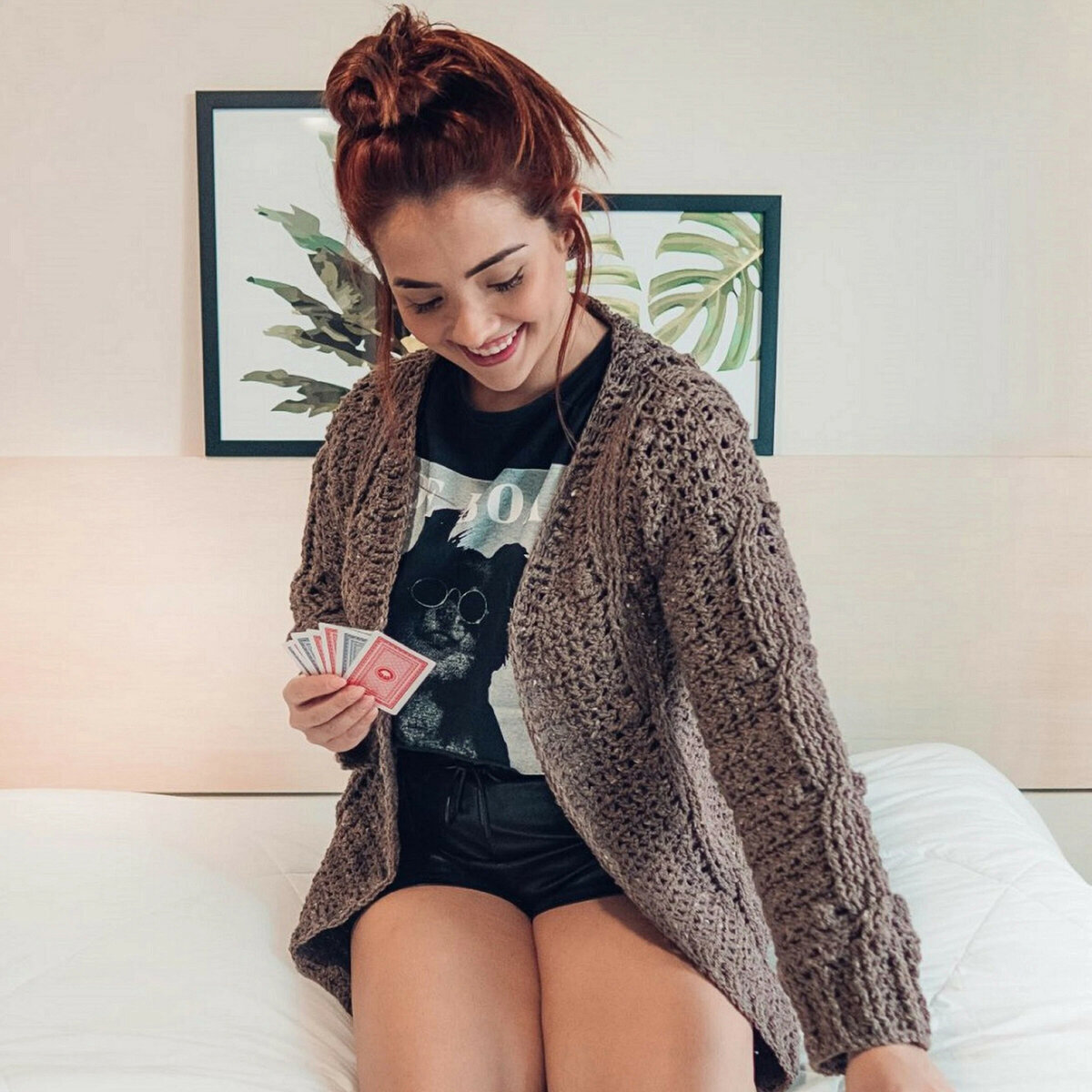 Для вязания нам потребуется 6 мотков — на размер 44-46 — светло-коричневой пряжи: 50% шерсть, 50% объёмный акрил; 100 гр — 200 м. Крючок № 4.