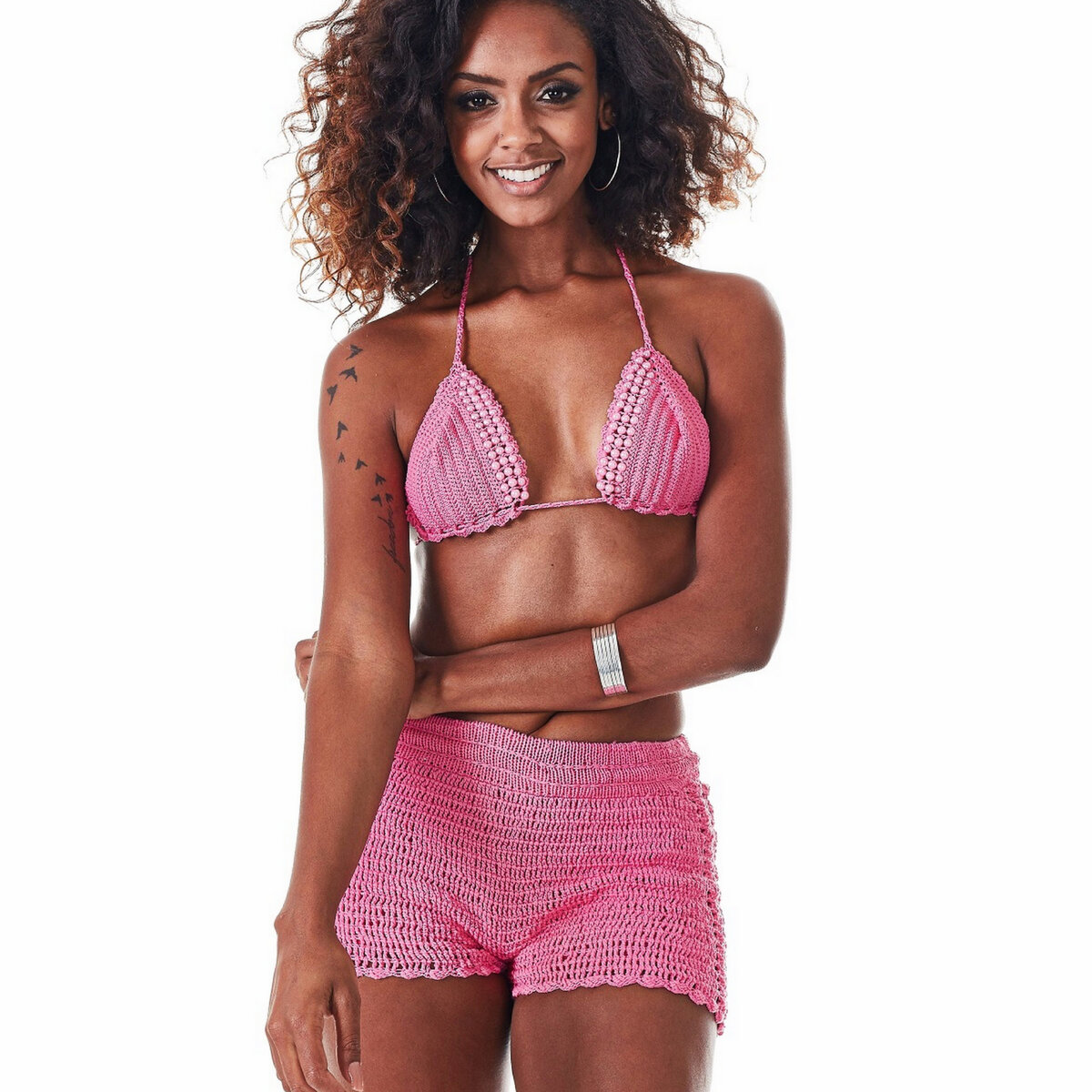 Сочно-розовый раздельный купальник — низ состоит из высоких шортиков, связанных из столбиков с накидом и украшенных несложными ажурными дорожками по бокам; лиф — классические треугольники, эффектно дополненные перламутровыми бусинками в тон.