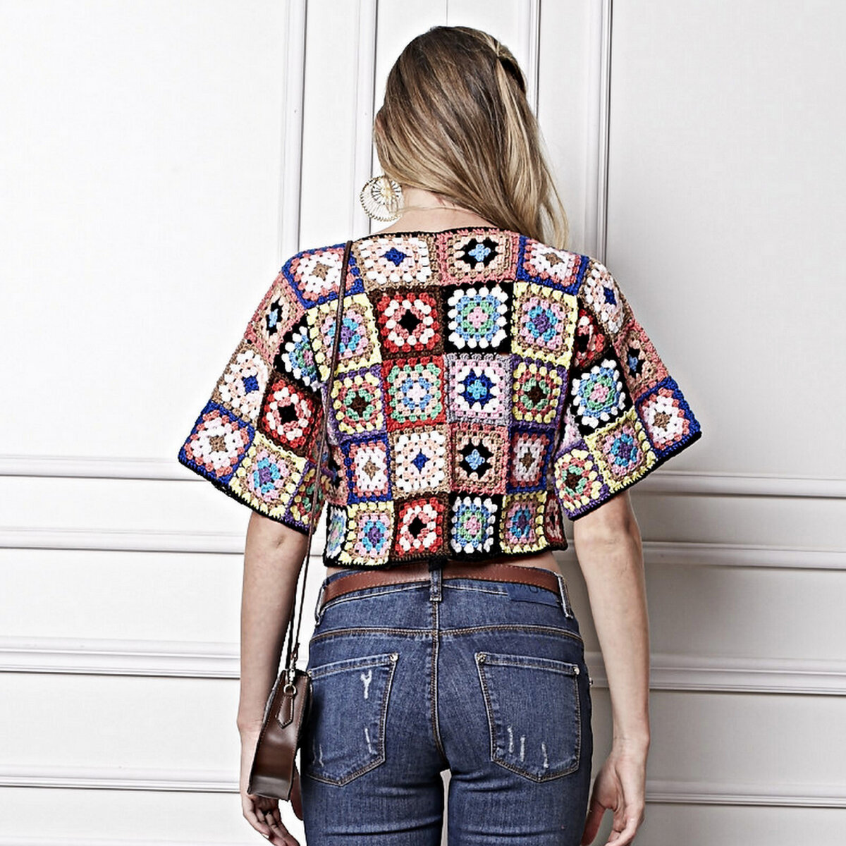 Укороченный топ свободного кроя с широкими рукавчиками до локтя и квадратным вырезом. Стильная модель, которую при желании можно трансформировать в не менее стильный джемпер, если довязать ещё квадратов снизу и на рукавах.