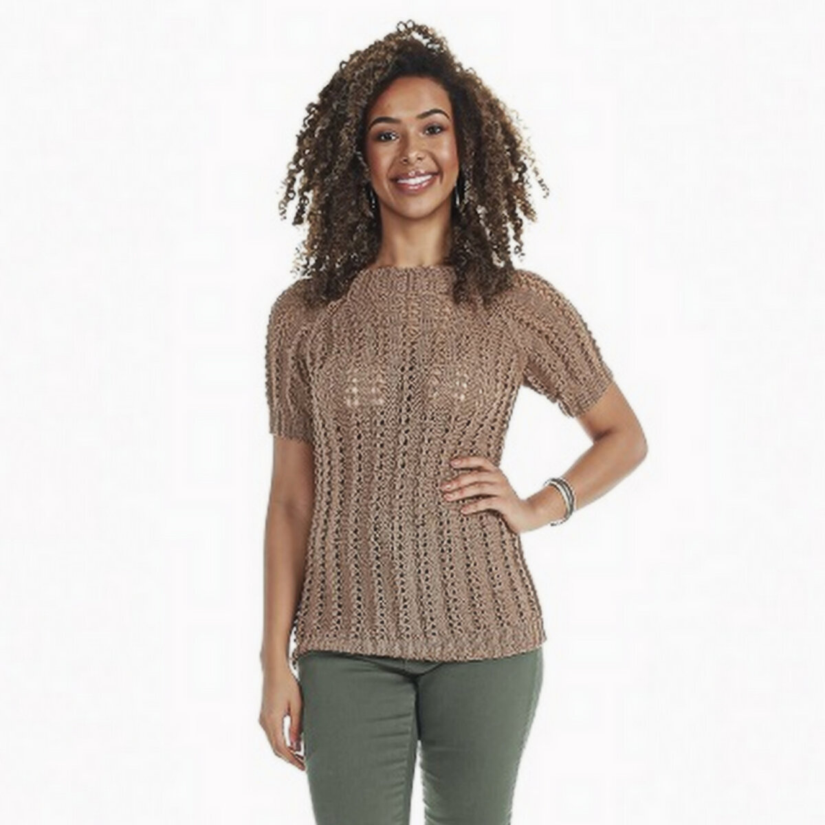 Стильный бежевый вариант с простым узором из ажурных дорожек. Прямой фасон до бедер, короткие рукава-реглан и небольшой круглый вырез горловины.