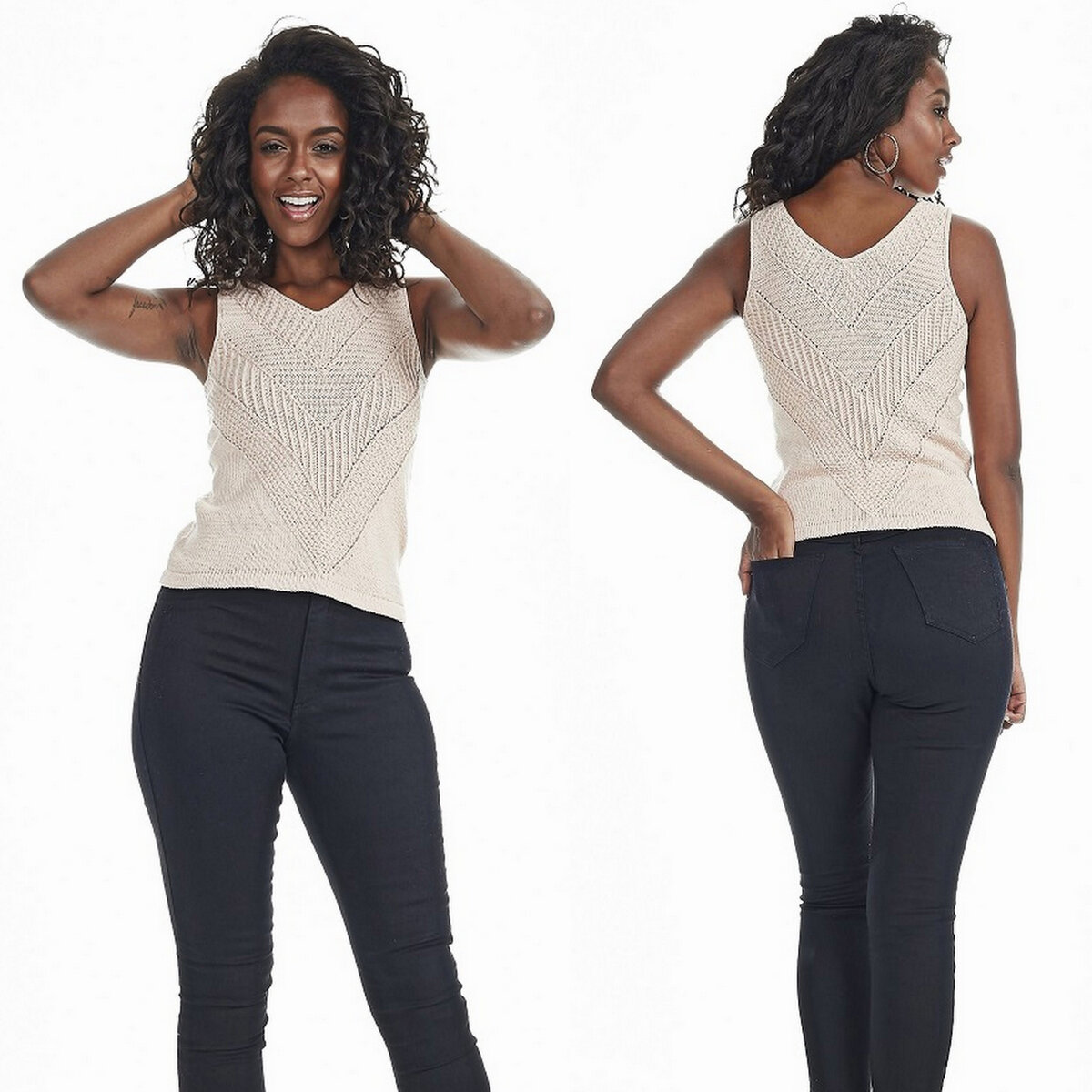 Элегантный топ натурально-белого цвета с интересным диагональным узором. Каждая полоса имеет свой рисунок — рисовая путанка, резинка 1 х 1 из скрещенных лицевых, платочка и шахматка. Прямой фасон до талии, небольшой V-образный вырез горловины.