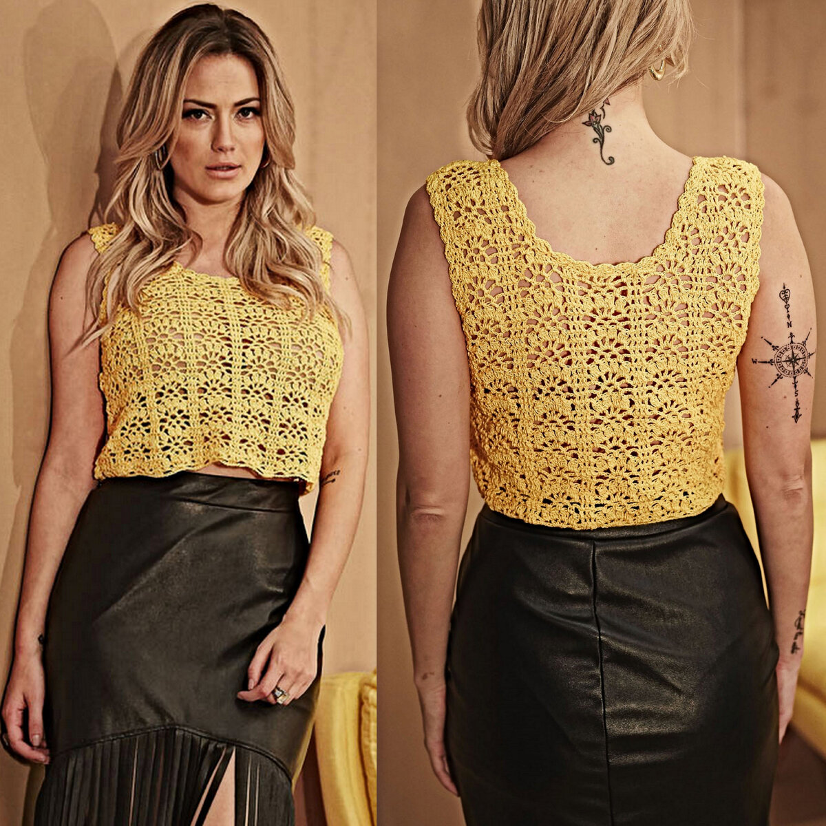 Простой кроп-топ цвета лимонно-кремового цвета. Укороченная модель чуть выше талии, широкие лямки и U-образный вырез горловины. Красивый и несложный ажур, с которым справится и новичок!