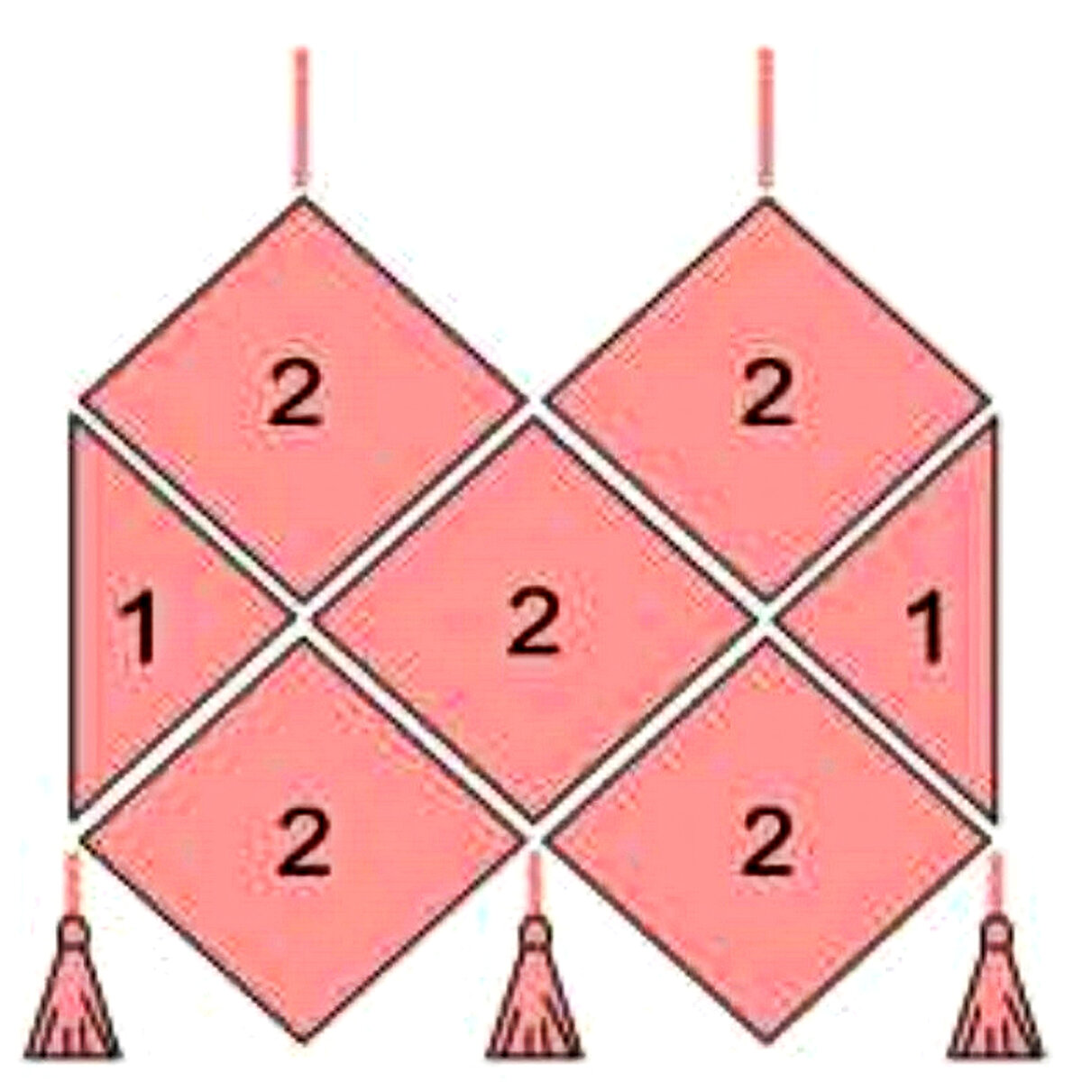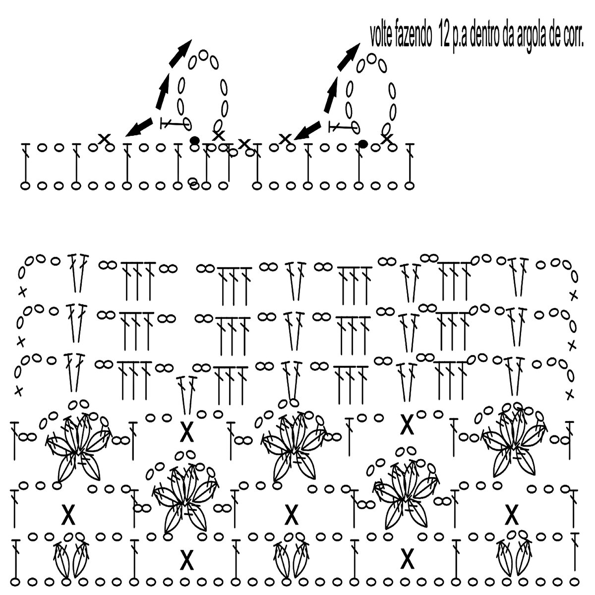 Розовый топ на тонких лямочках, украшенный кисточками. Модель связана из крупных квадратных мотивов, за счёт этого получается необычный крой с треугольными вырезами впереди и сзади. Глубокий V-образный вырез горловины.