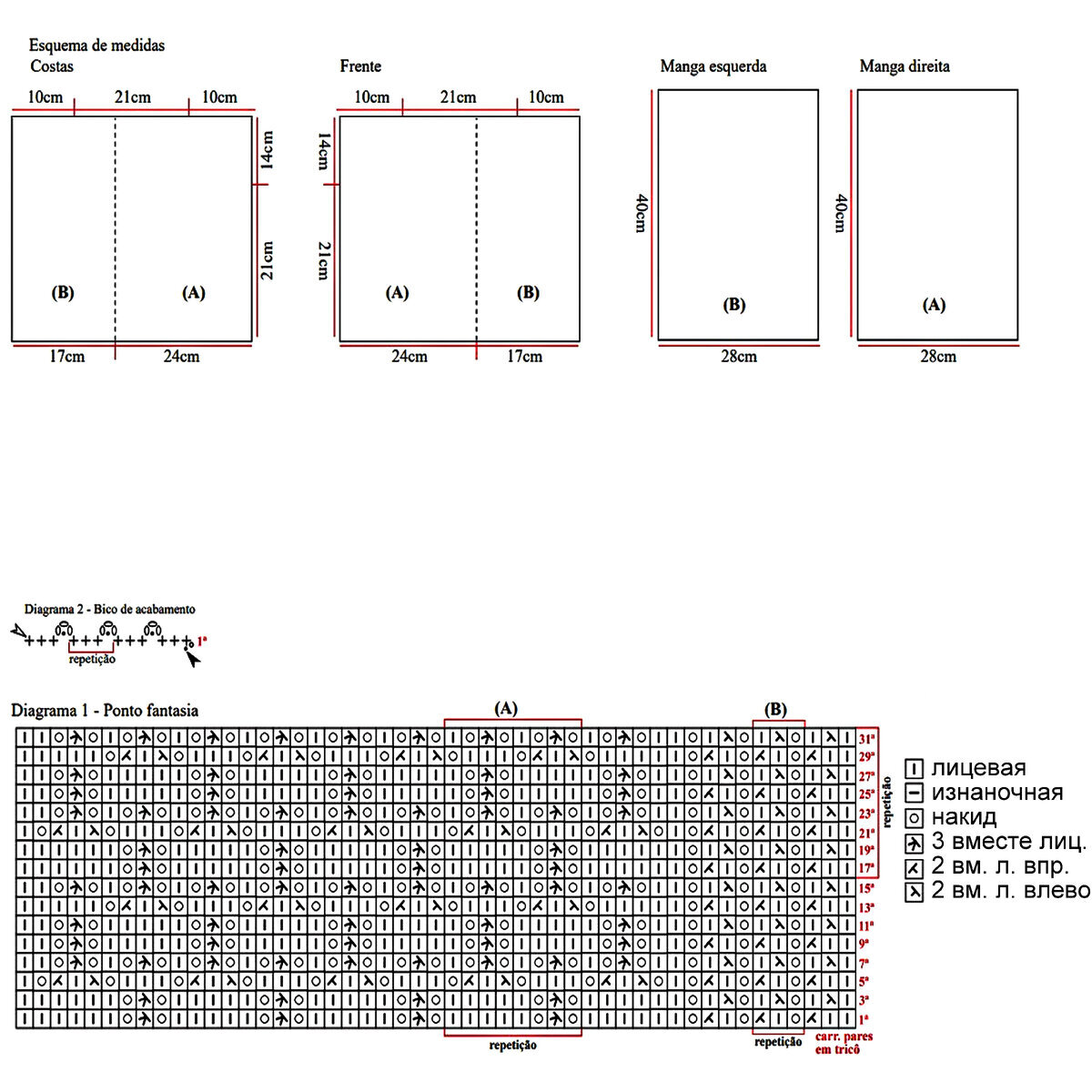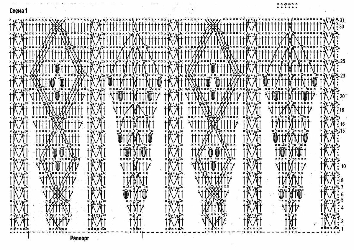 Раппорт узора 28 петель и 22 ряда в высоту. На схеме указаны и лицевые, и изнаночные ряды.