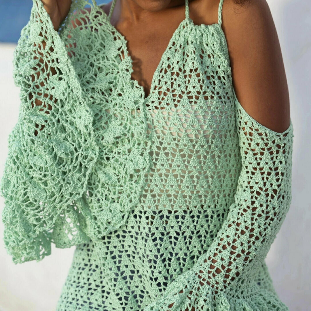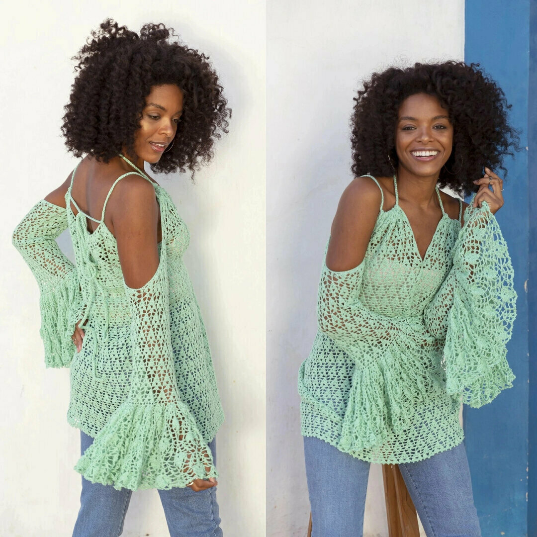 Восхитительная блузка крючком с рукавами-воланами и кокетливо открытыми плечами. Такая модель придаст образу особую женственность и романтичность. Удлинённая блузка вполне сойдёт и за пляжную тунику — можно надеть с лёгкими шортами или поверх купальника.