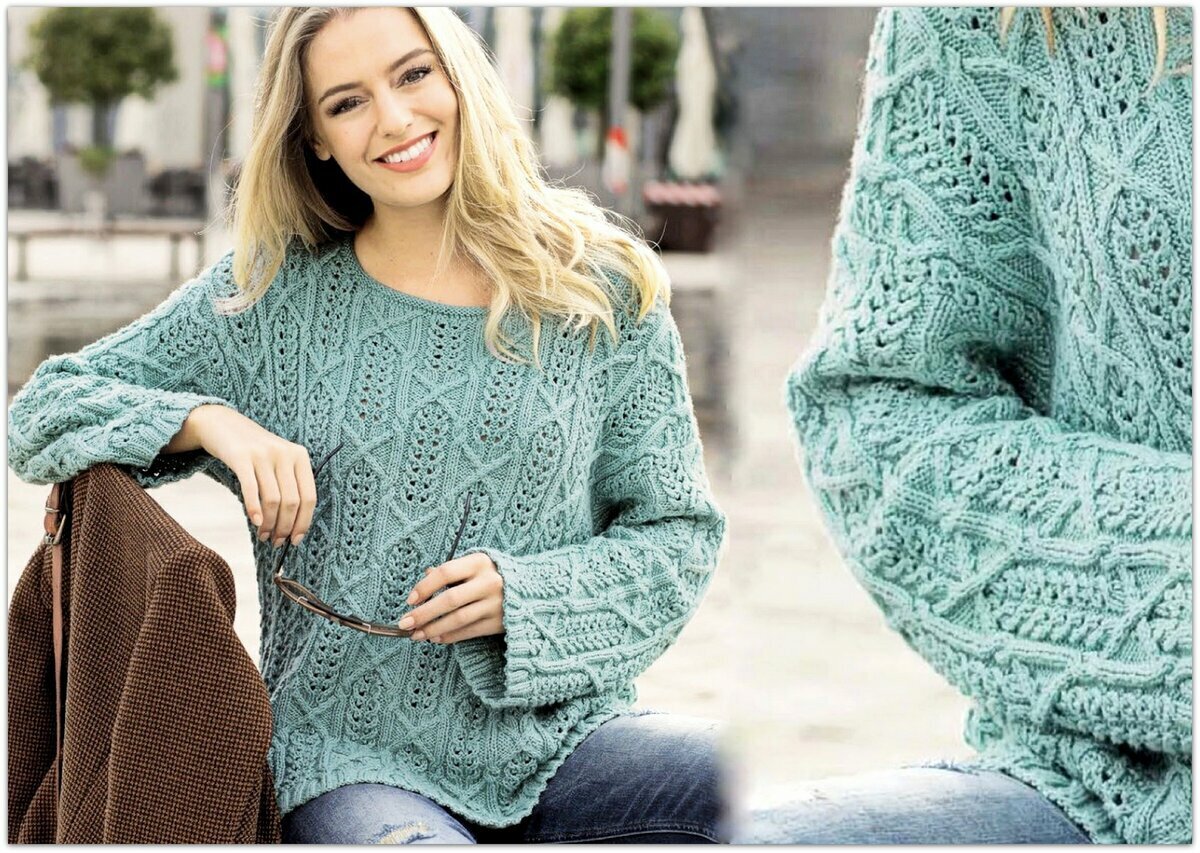 Стильный просторный джемпер спицами прохладного мятно-зелёного цвета. Лёгкая и одновременно тёплая модель с оригинальным узором из ажурных кос и арановых переплетений.