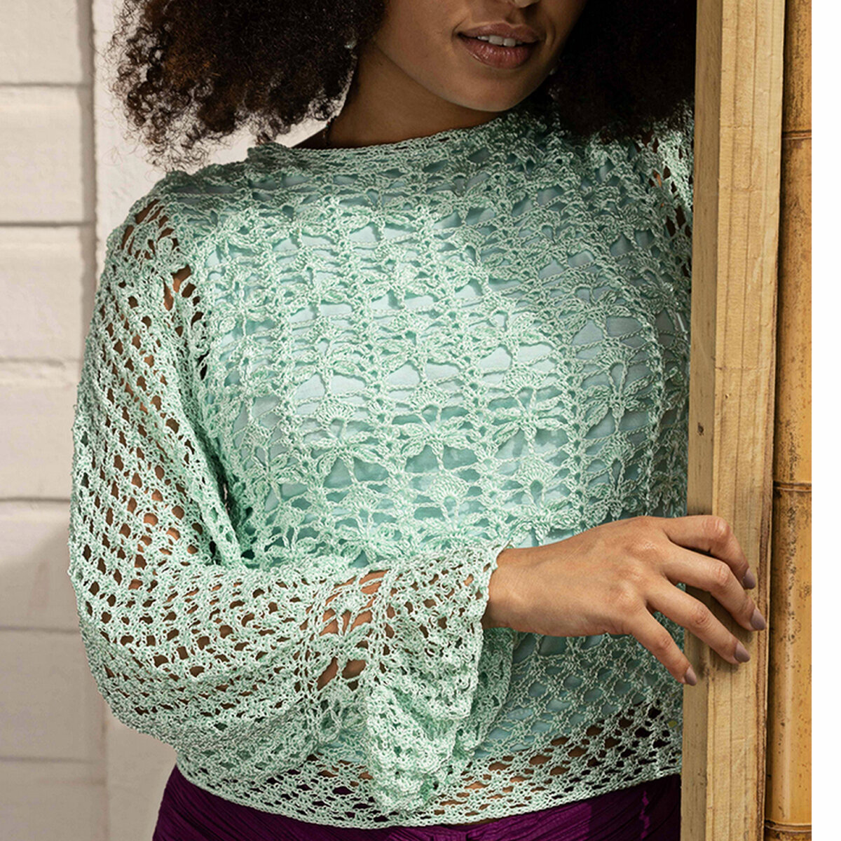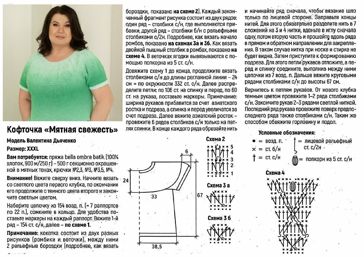Этот пуловер крючком цвета сочной мяты отлично сочетает в себе рельефный узор, ажурную сетку и крупную вязку. Кто сказал, что такие узоры годятся только для тонкой пряжи? Прямой фасон, втачной рукав-труба и небольшой V-образный вырез горловины впереди.