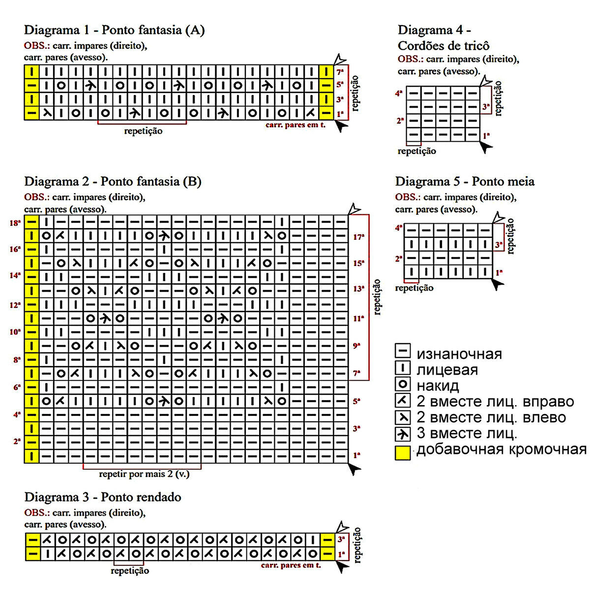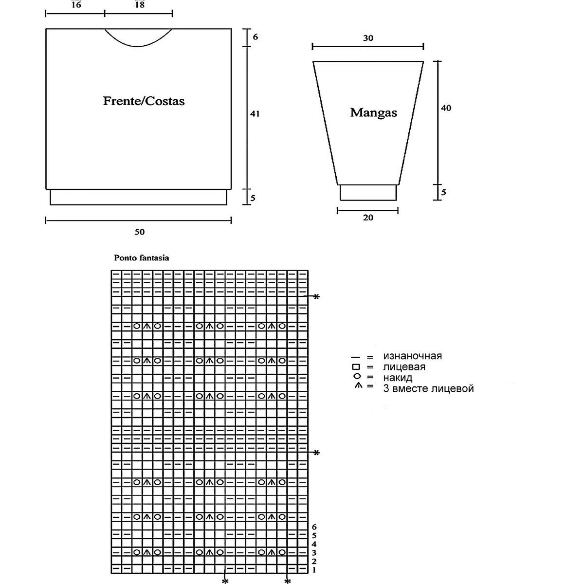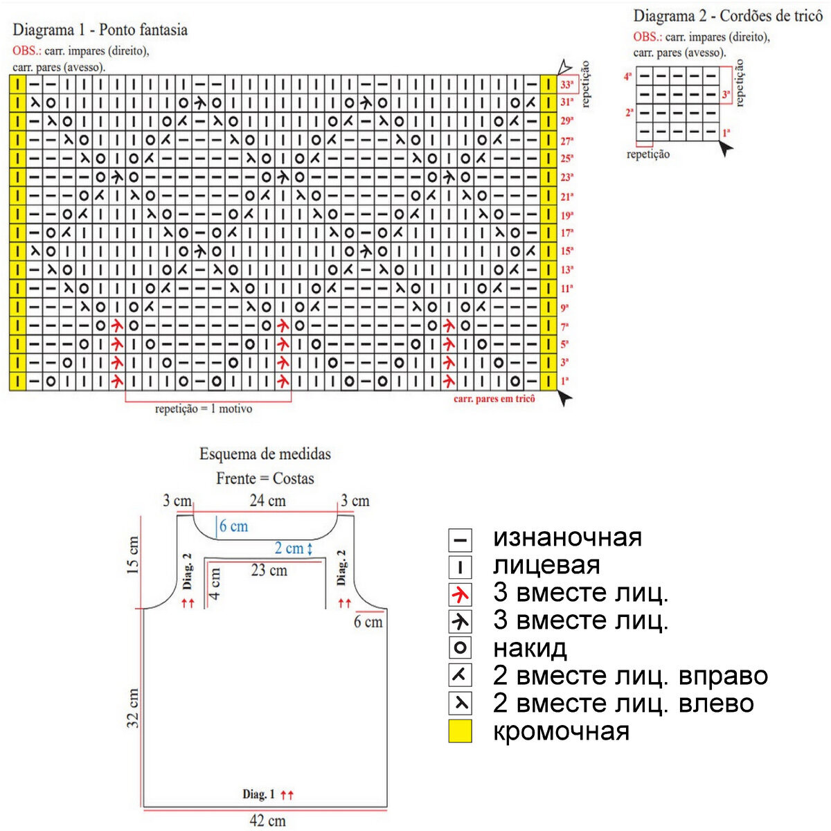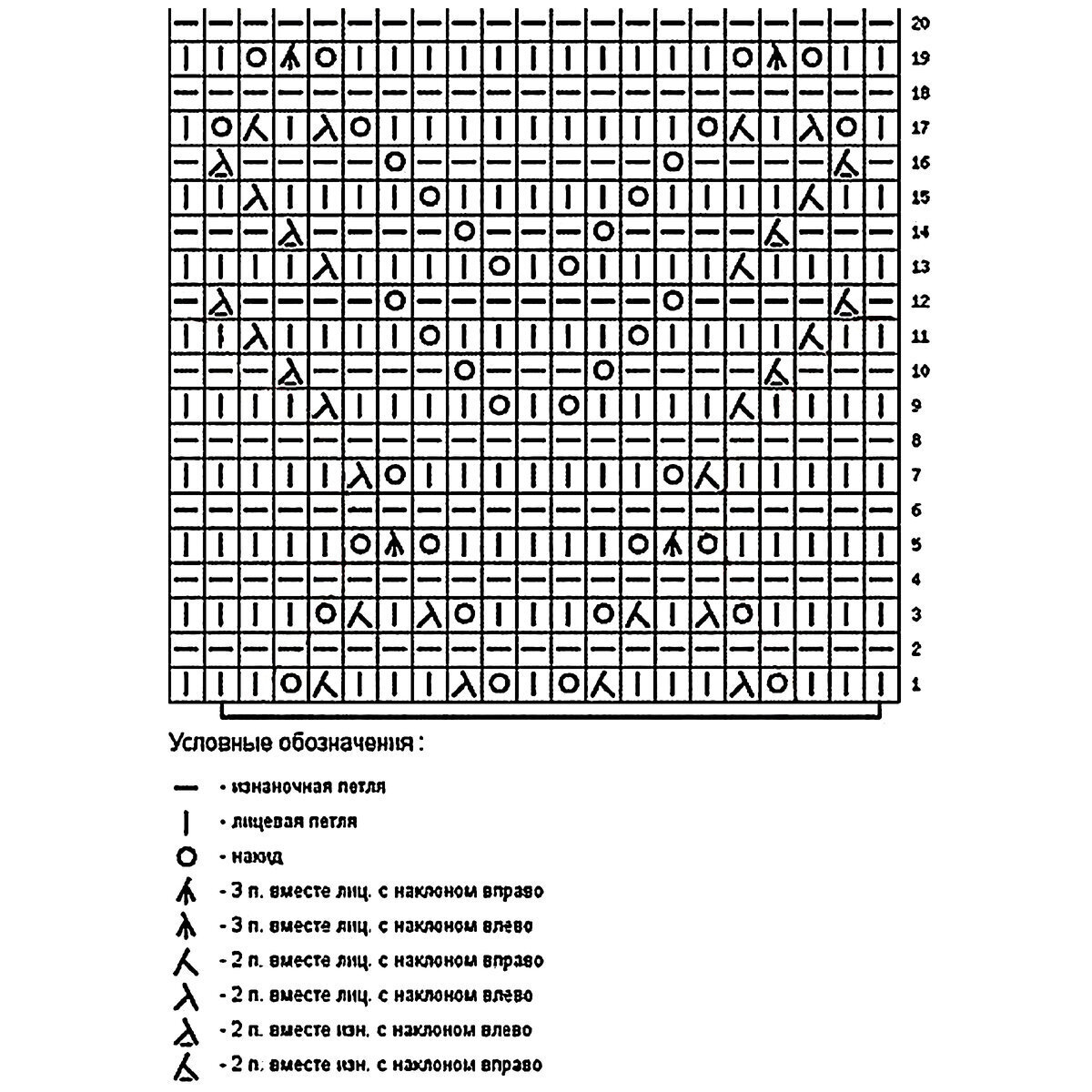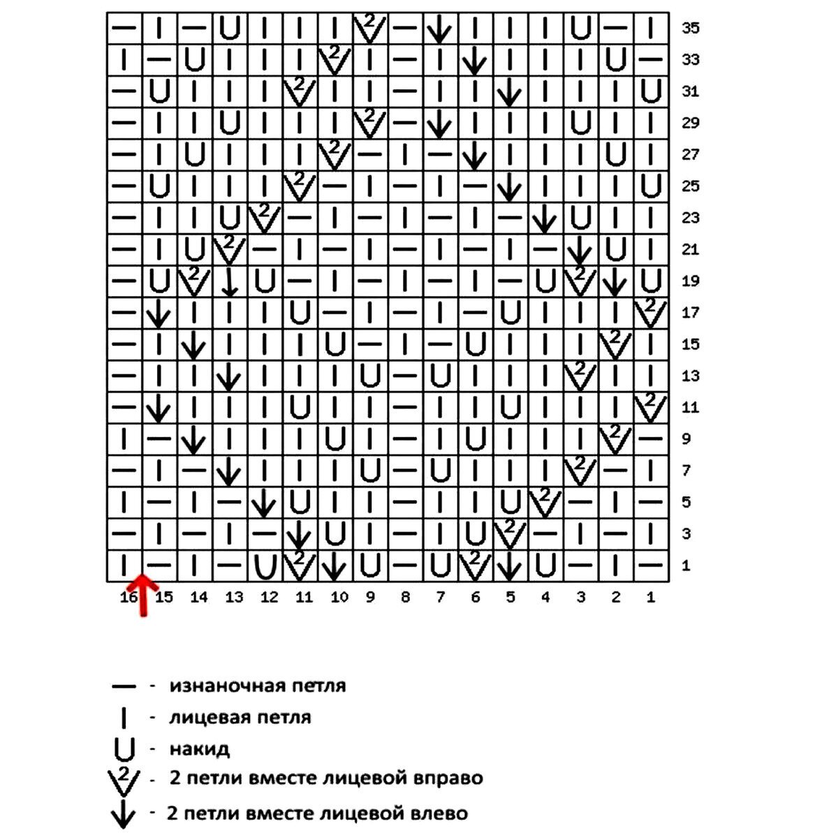 На схеме указаны и лицевые, и изнаночные ряды. Обратите внимание, что узор, начиная с 9-го ряда, вяжется в каждом ряду!
