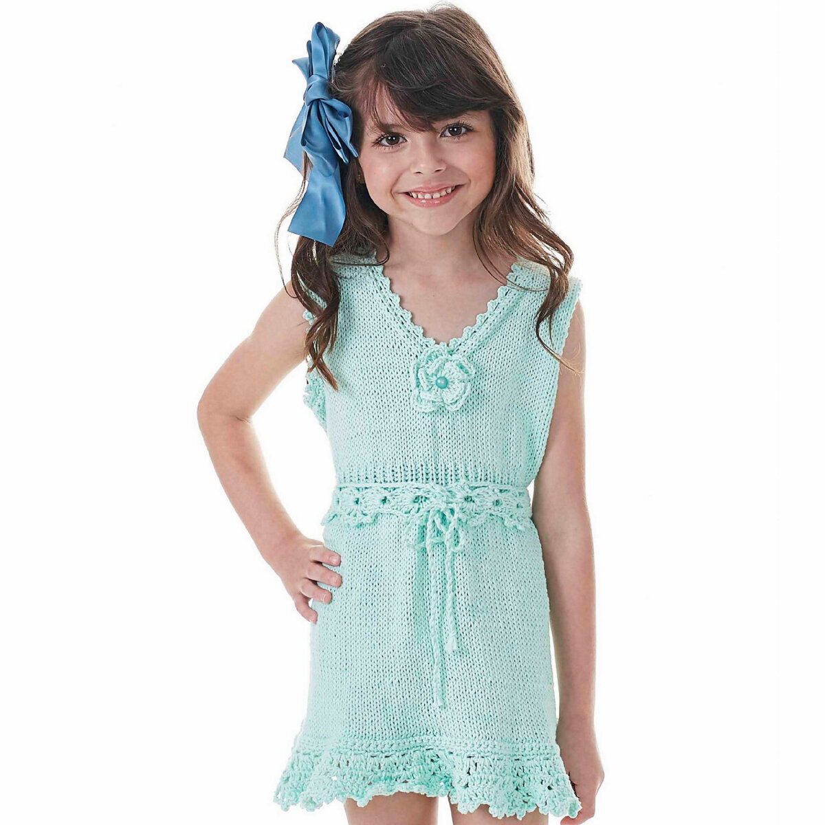 Для вязания нам потребуется 5 мотков — на возраст 6-7 лет — пряжи цвета мяты: 100% хлопок; 100 гр — 113 м. Спицы № 3,5-4 и крючок № 3.