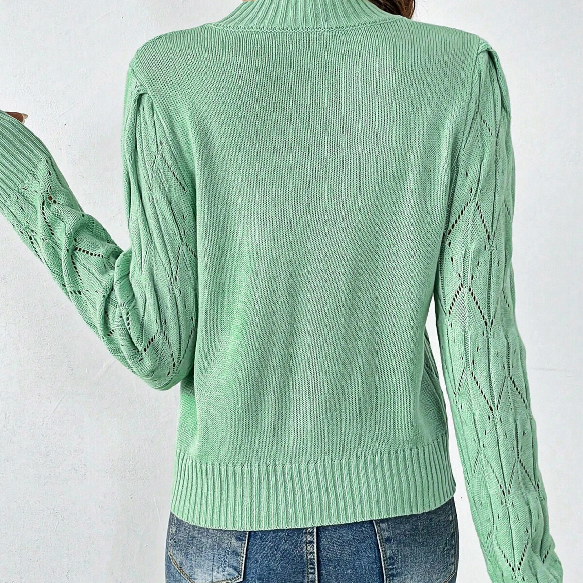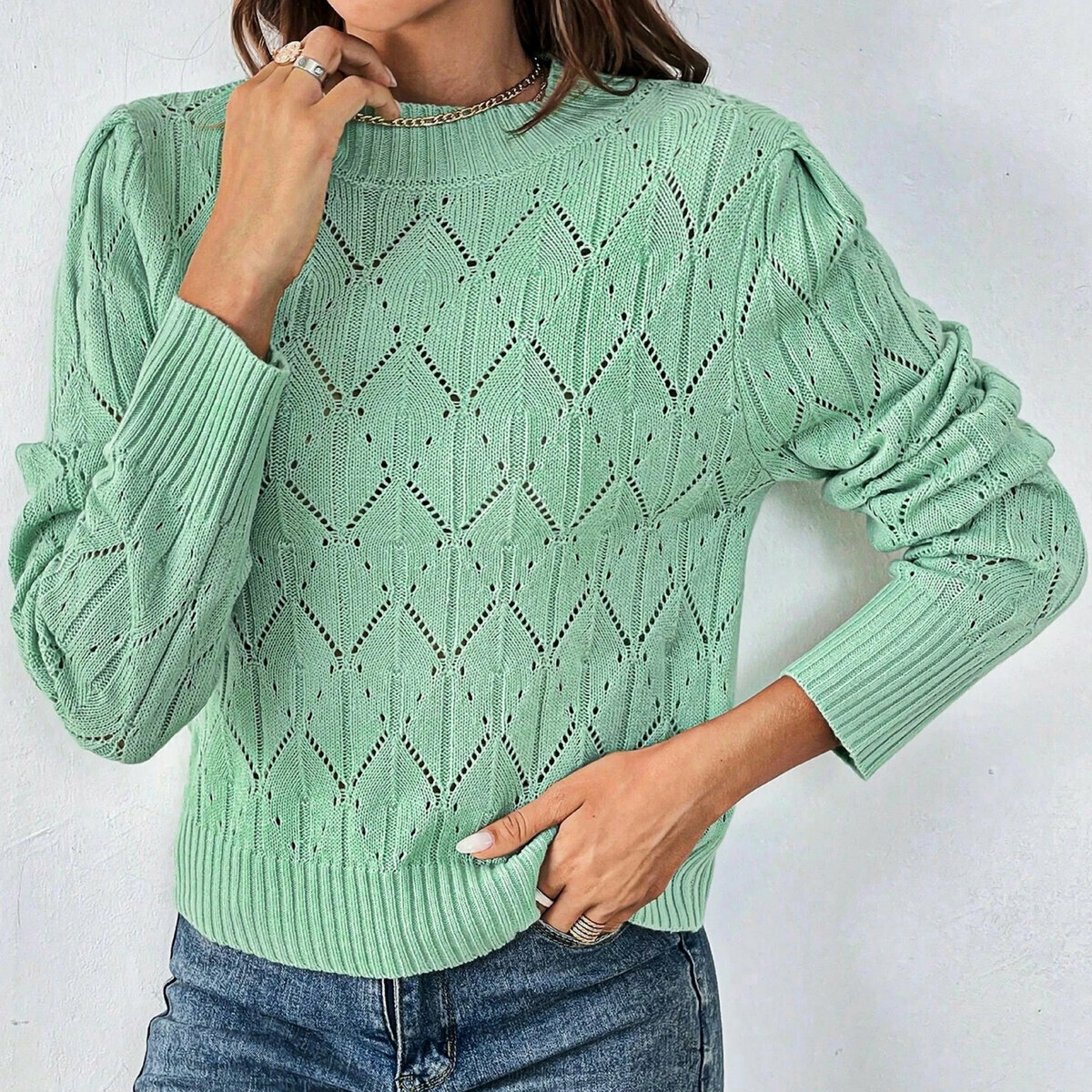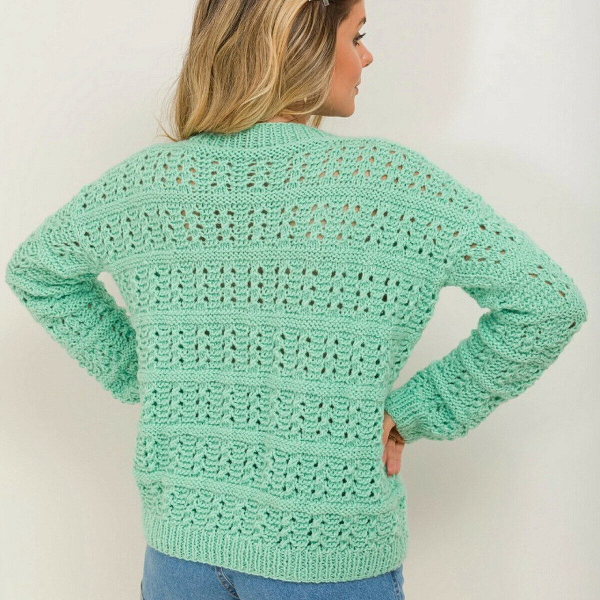Ажурный мятно-зелёный свитер спицами. Женственная, слегка приталенная модель до пояса, узкий втачной рукав 3/4 и круглый вырез горловины.
