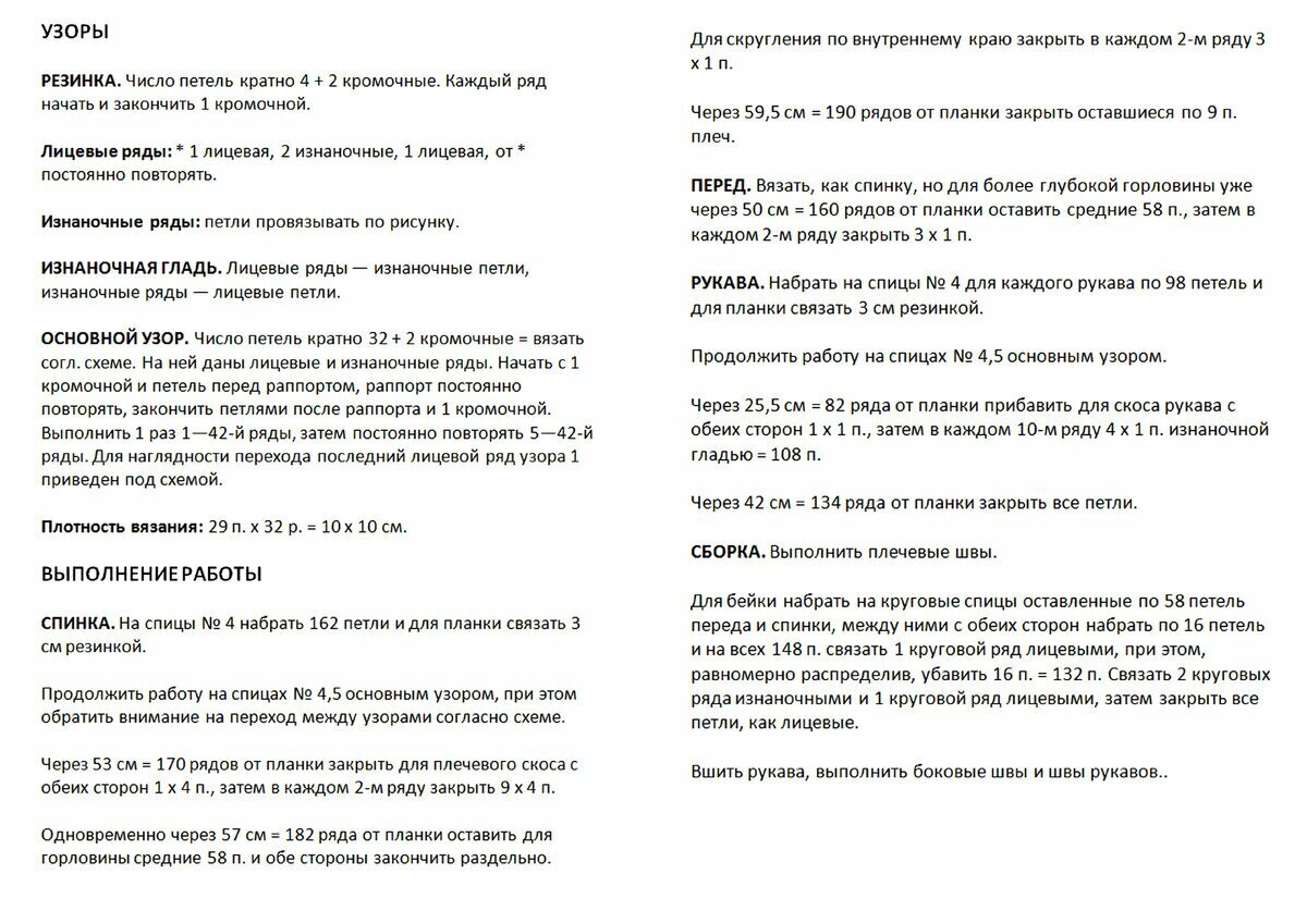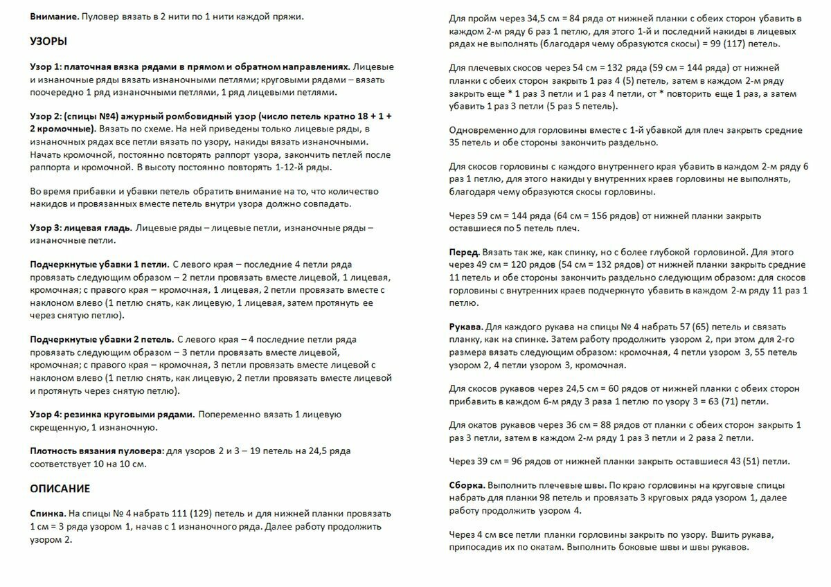 Основная часть джемпера вяжется лицевой гладью, только по центру идёт вставка из ажура. Отделка по низу, манжеты и горловина — резинка 2 х 2 (2 лиц., 2 изн.).