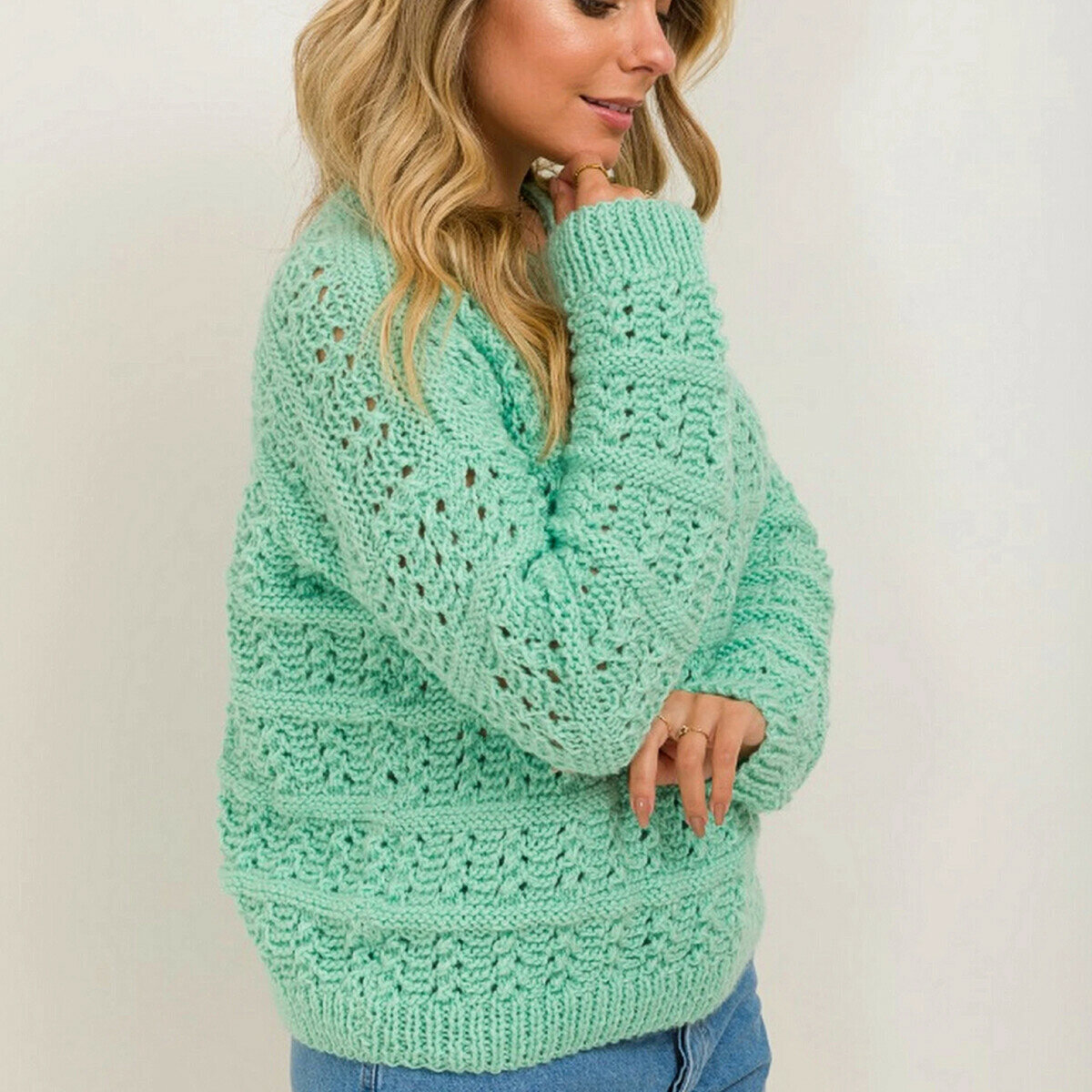Пастельно-мятный джемпер спицами с россыпью крохотных пайеток — модель Алины Оганесян.