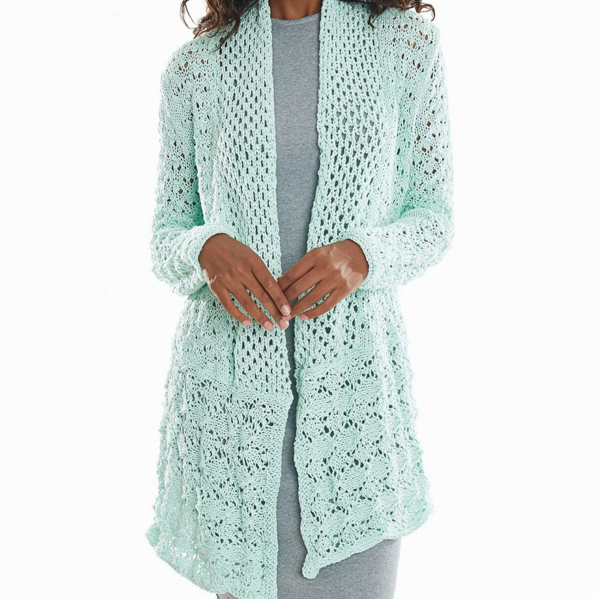 Для вязания данной модели нам потребуется 8 мотков — на размер 44-46 — пряжи цвета нежной мяты: 100% хлопок; 100 гр — 180 м. Спицы № 4,5.