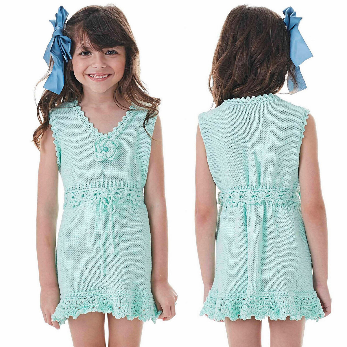 Симпатичное платье для девочки, связанное лицевой гладью спицами и украшенное кружевом крючком. Простая и нежная детская модель.