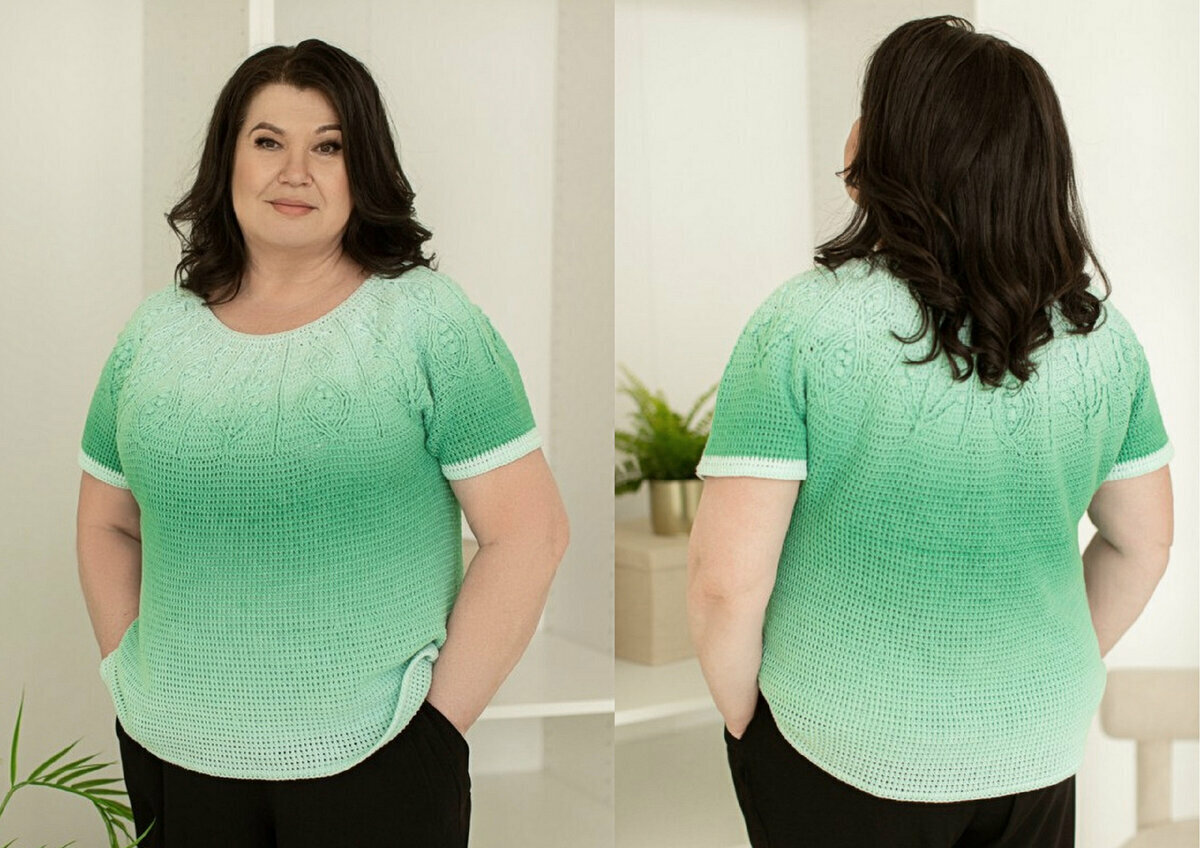 Эффектный топ плюс-сайз с оригинальной кокеткой от рукодельницы Валентины Дьяченко. От такого я бы и сама не отказалась, жаль, что мало крючком вяжу.
