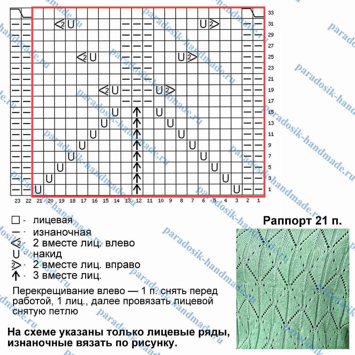 Раппорт узора 21 петля и 34 ряда в высоту. На схеме указаны только лицевые (нечётные) ряды, изнаночные (чётные) вязать по рисунку.
