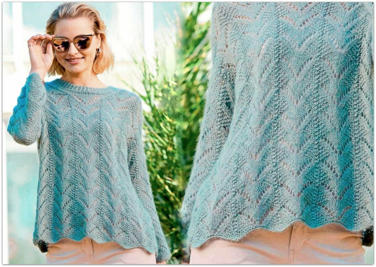 Джемпер связан регланом сверху, основной узор — лицевая гладь. Ажурная вставка идёт только по центру джемпера спереди. Рукава три четверти. Рекомендуемая пряжа — Alize Angora Gold Star (цвет № 114 мята).