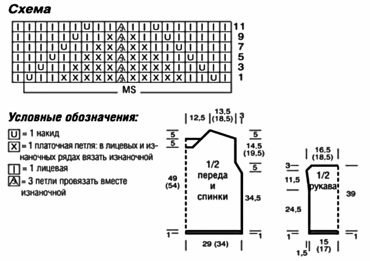 - 2. Вязать две детали поперечно: левый рукав и левую часть джемпера сеткой и правый рукав и правую часть джемпера крупным ажуром — сшить посередине.