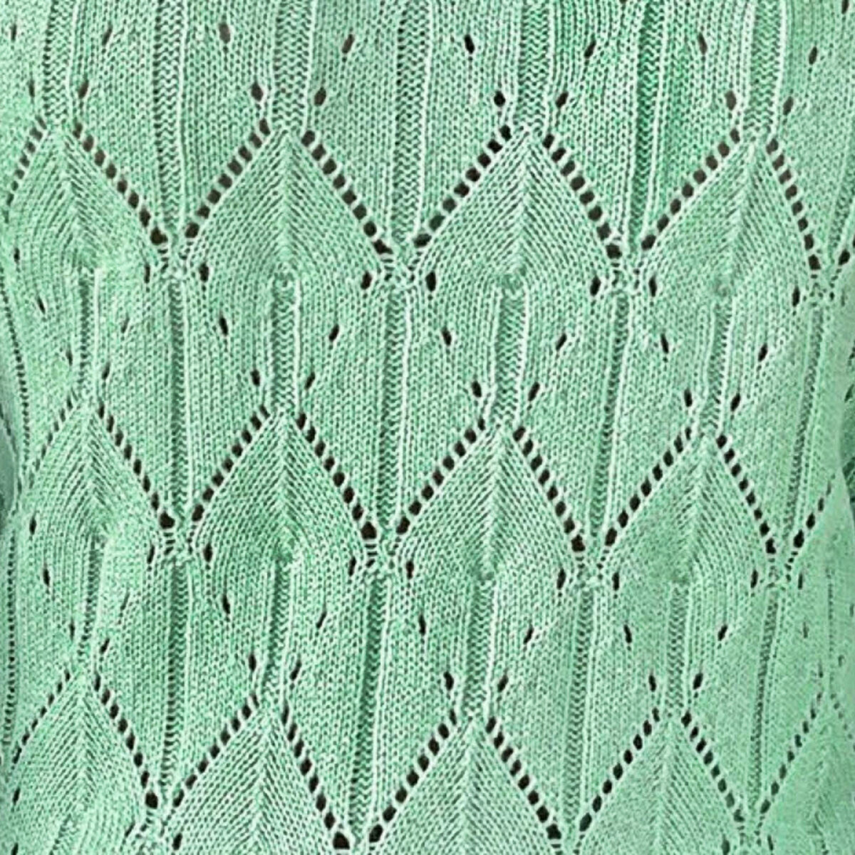 Неоново-мятный топ спицами с простым узором из зигзагов. Прямой фасон чуть выше талии, спущенный рукав, плечевые скосы и небольшой вырез лодочкой.