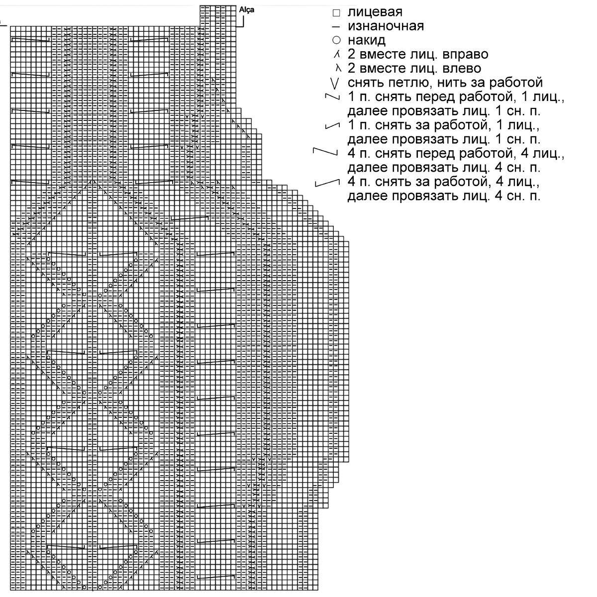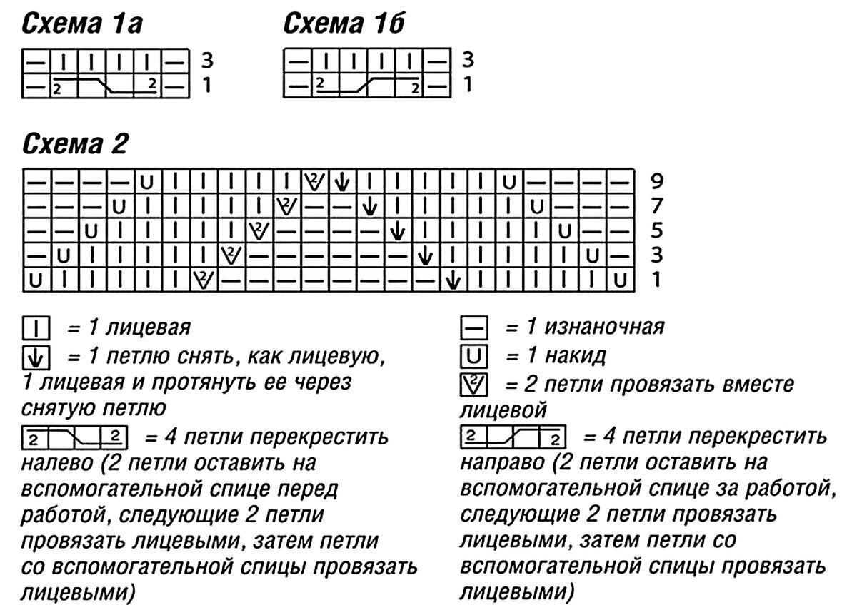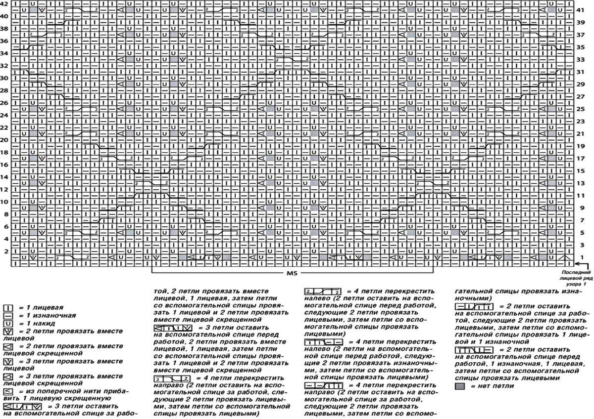 На схеме указаны только лицевые ряды, изнаночные вязать по рисунку. Пустой квадрат — нет петли (то есть учитывать его при вязании по схеме не нужно, добавлено исключительно для удобства чтения).