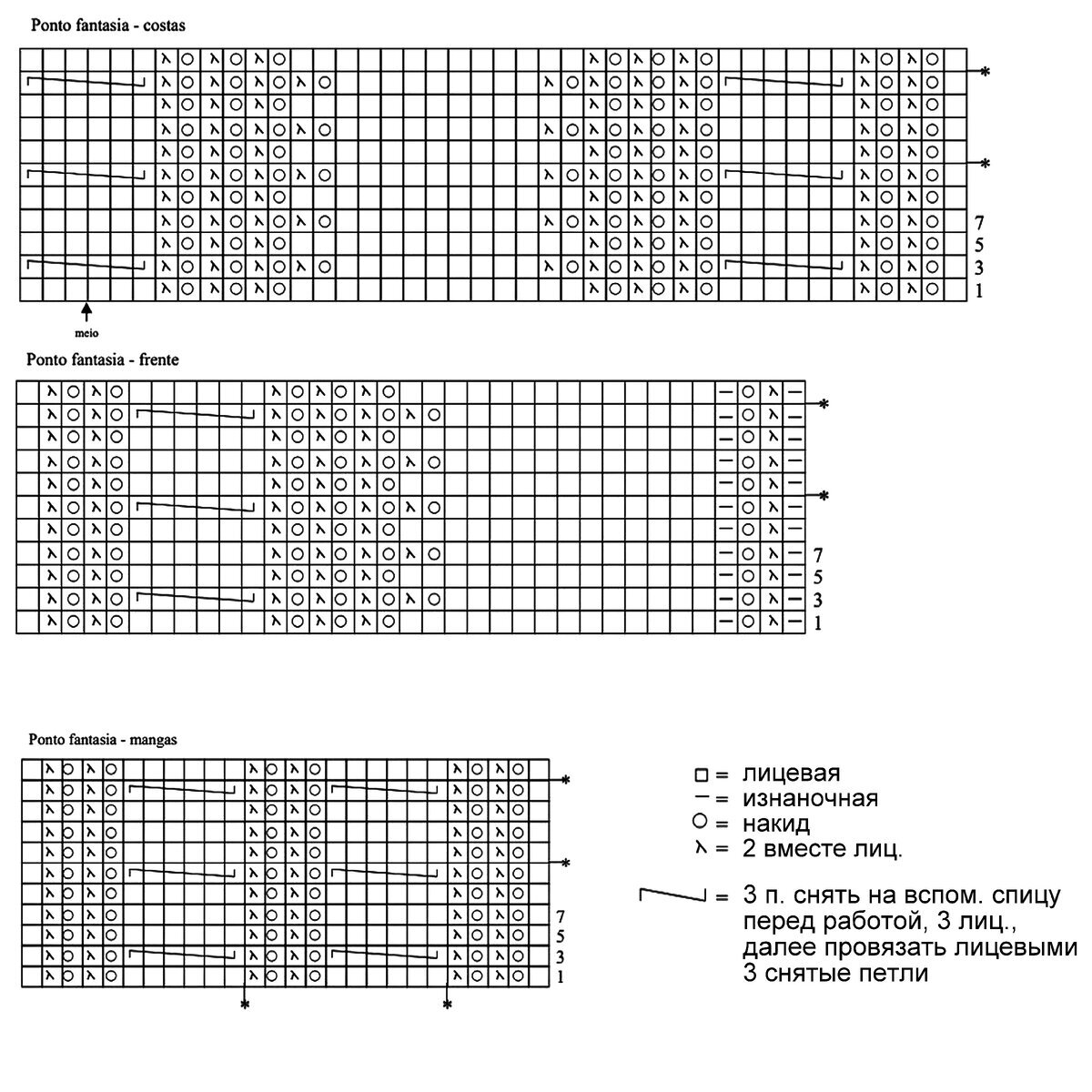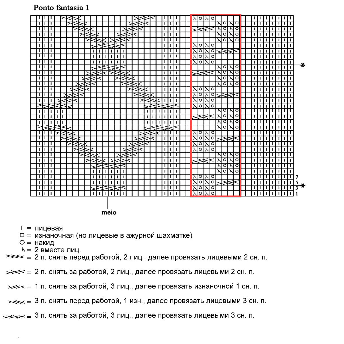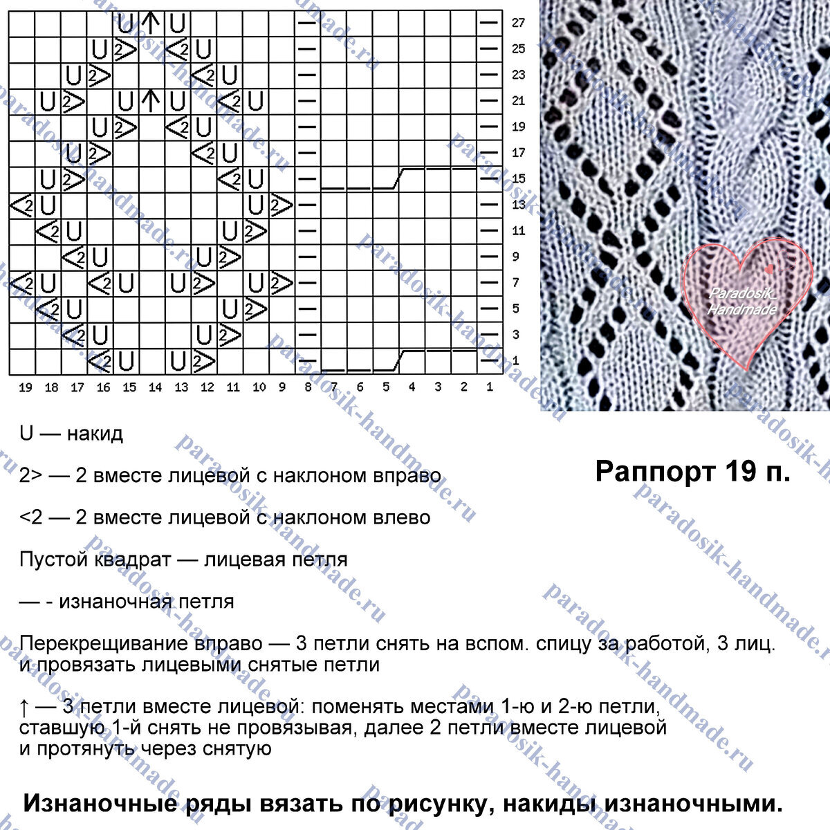 На схеме указаны только лицевые ряды, изнаночные вязать по рисунку. Пустой квадрат — нет петли (то есть учитывать его при вязании по схеме не нужно, добавлено исключительно для удобства чтения).