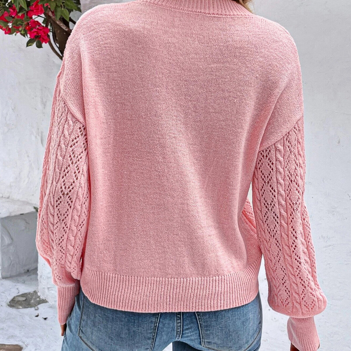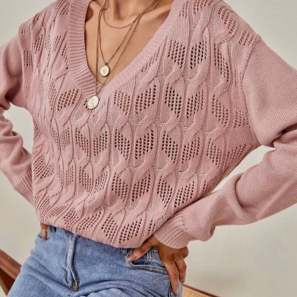 Нежный пудрово-розовый пуловер с диагональным ажурным узором и крупными жгутами. Простой H-образный фасон, спущенный рукав, зауженный книзу.