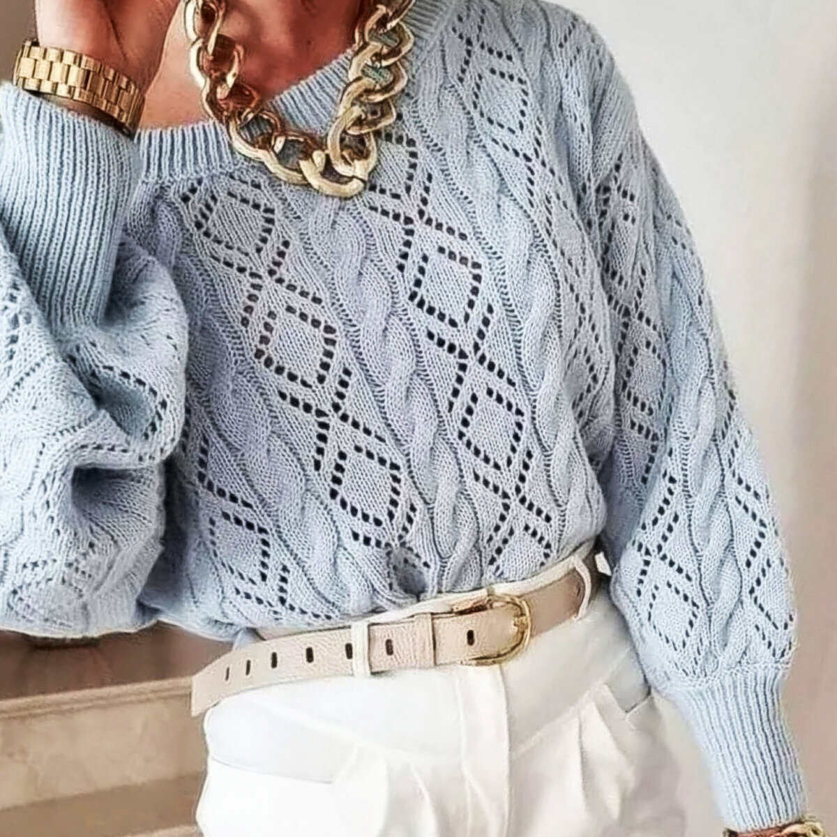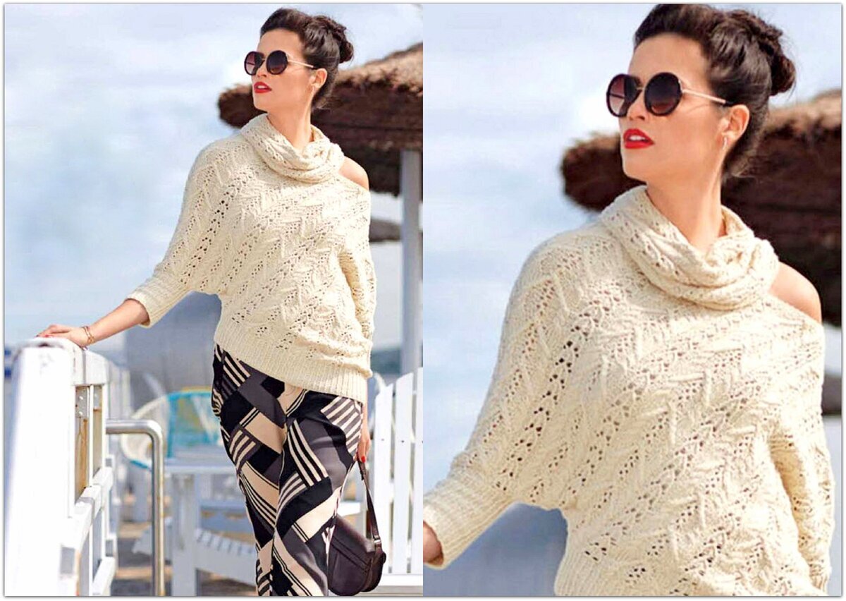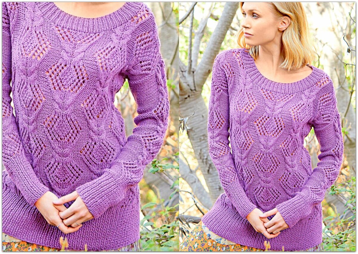 Ажурные ромбы и жгуты — это уже классика! Такое сочетание узоров всегда будет в моде и всегда актуально. Остальное, конечно, зависит от выбранной пряжи и фасона модели. В данном случае у нас джемпер с широким вырезом-лодочкой — такой вырез можно кокетливо приспускать на одно плечо. Пару лет назад подобные вырезы были очень популярны и вот они снова возвращаются.