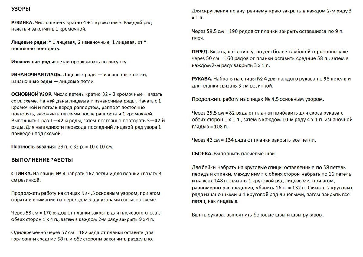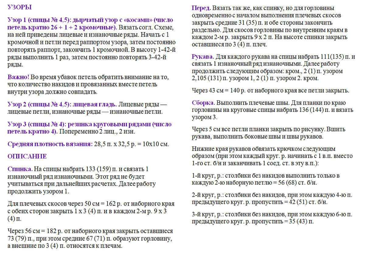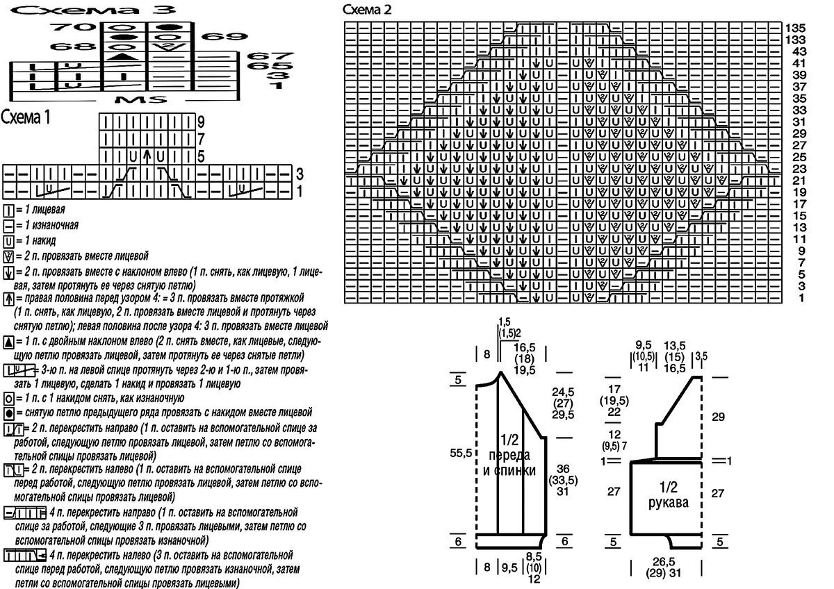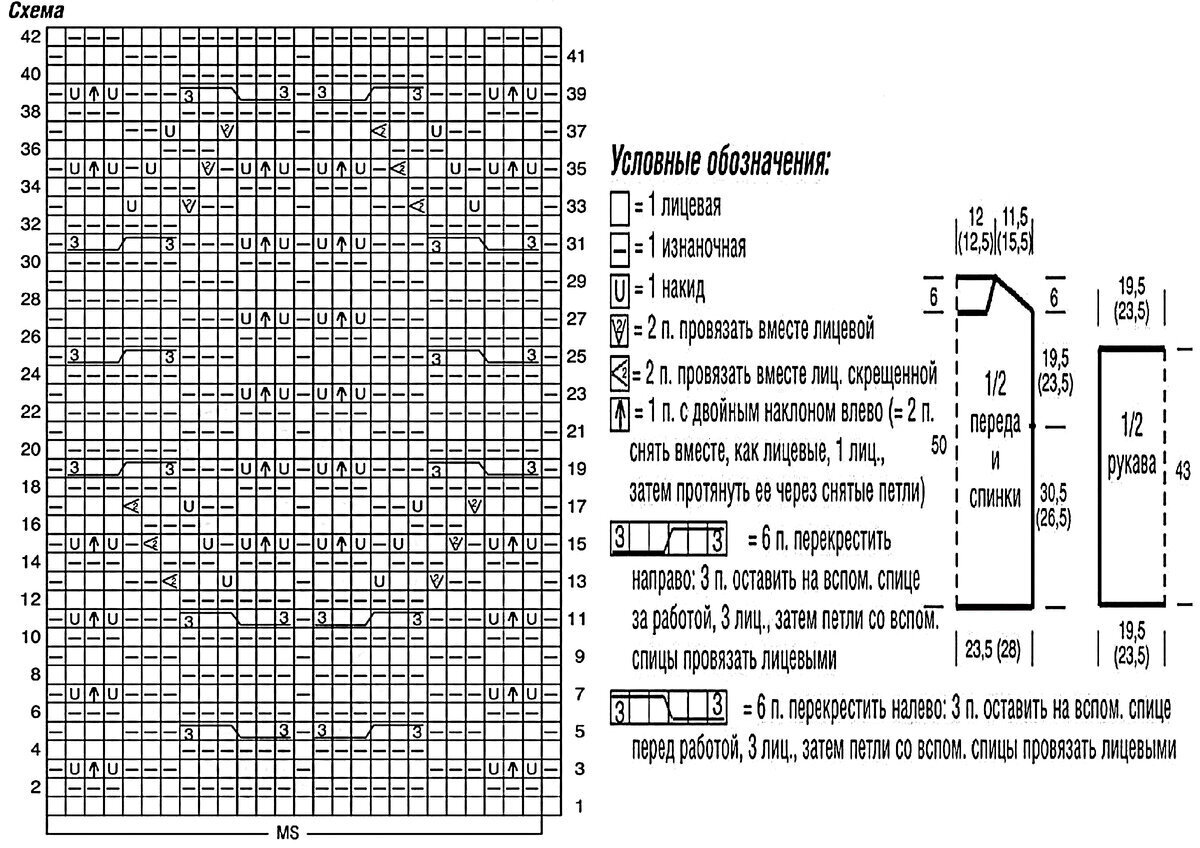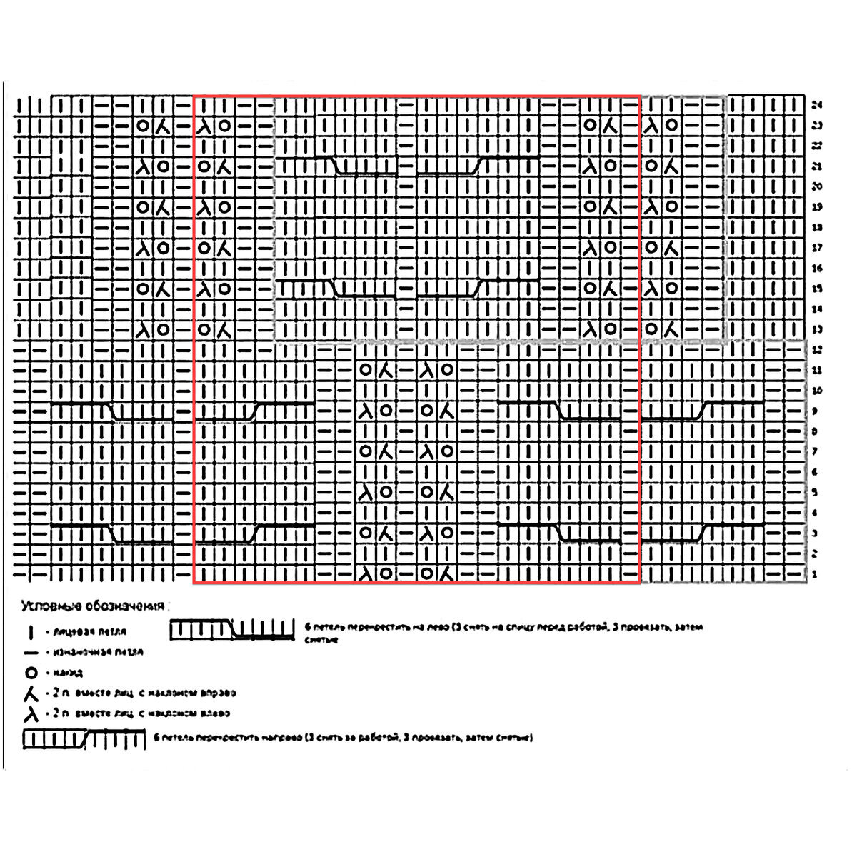 Друзья, будьте внимательны! В оригинальной схеме есть ошибка или, вернее, недочёт — пустой квадрат в условных обозначениях идёт как изнаночная петля, но это обозначение верно не для всей схемы! Если посмотреть внимательно на изделие, то в ажурном узоре с косами пустой квадрат идёт как лицевая петля. Я уточнила этот момент в расшифровке и выделила узор красным (этот же узор идёт на схеме для рукавов и там все пустые квадраты обозначают лицевую петлю).