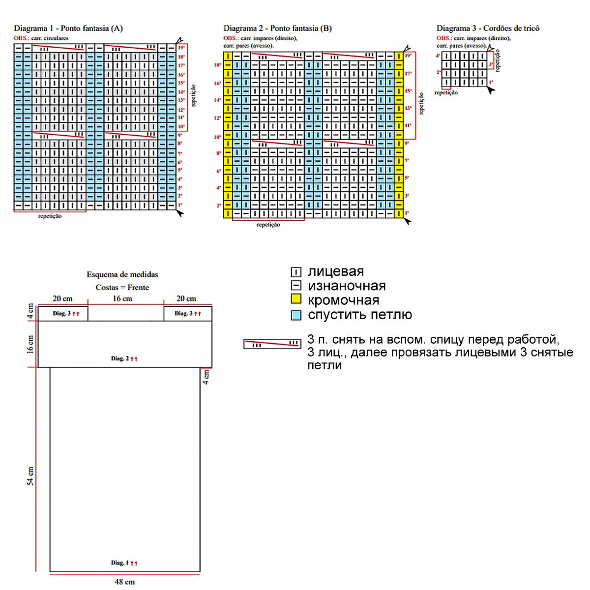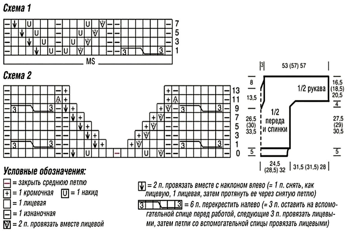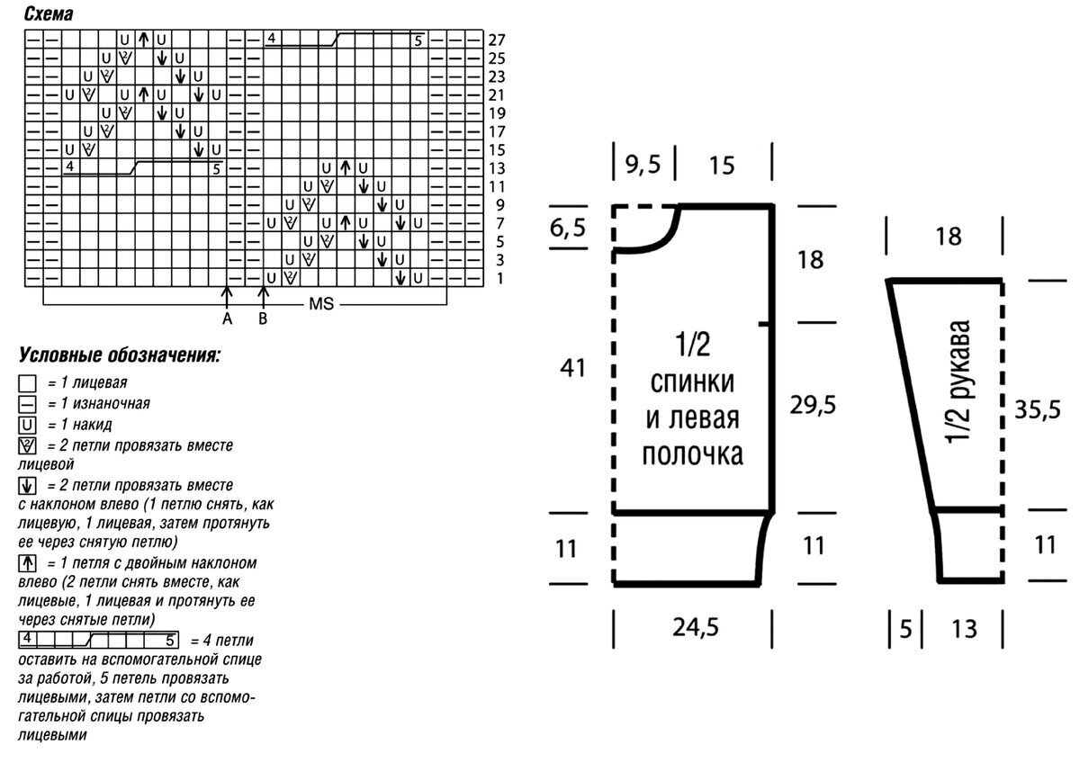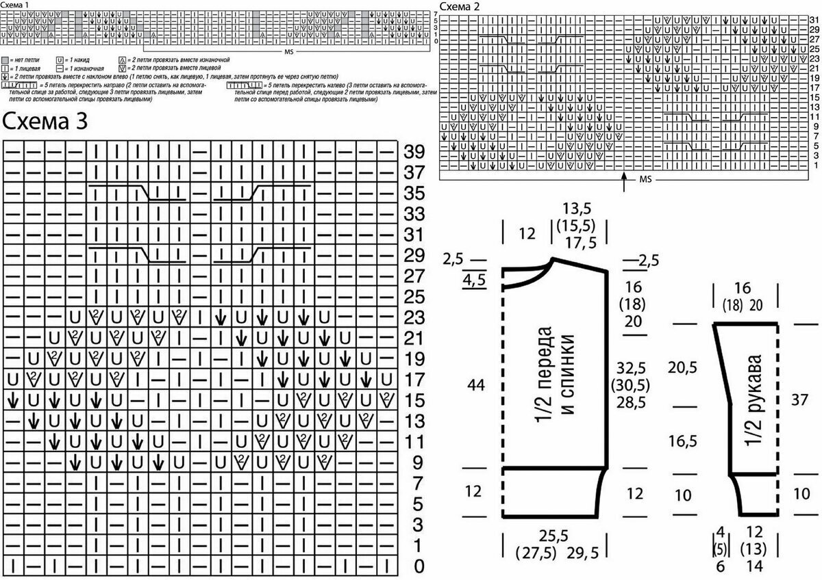 Друзья, будьте внимательны! В оригинальной схеме есть ошибка или, вернее, недочёт — пустой квадрат в условных обозначениях идёт как изнаночная петля, но это обозначение верно не для всей схемы! Если посмотреть внимательно на изделие, то в ажурном узоре с косами пустой квадрат идёт как лицевая петля. Я уточнила этот момент в расшифровке и выделила узор красным (этот же узор идёт на схеме для рукавов и там все пустые квадраты обозначают лицевую петлю).