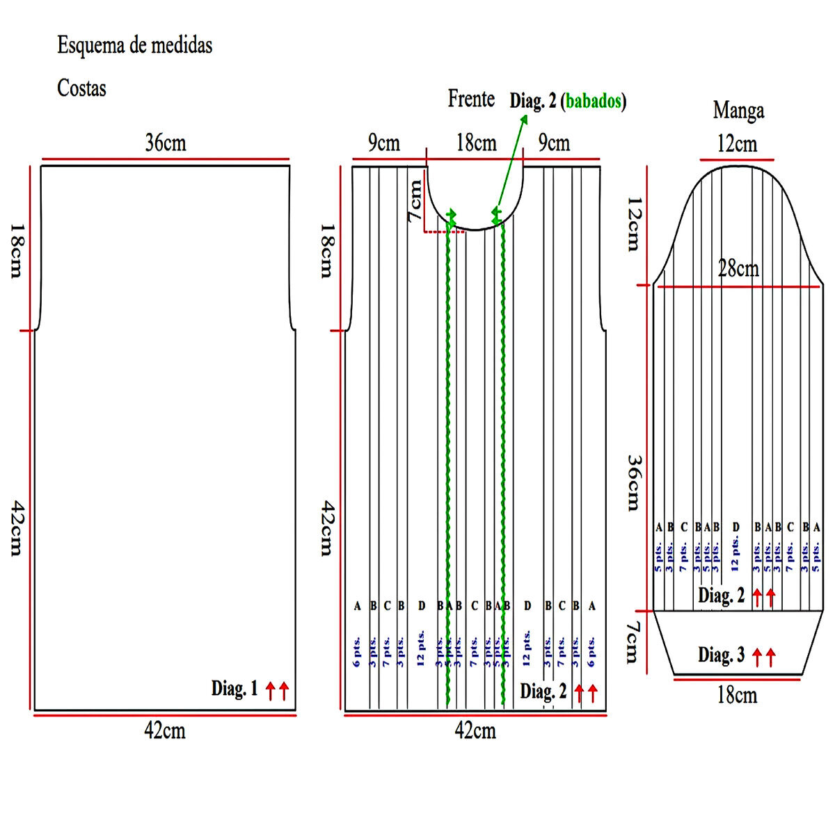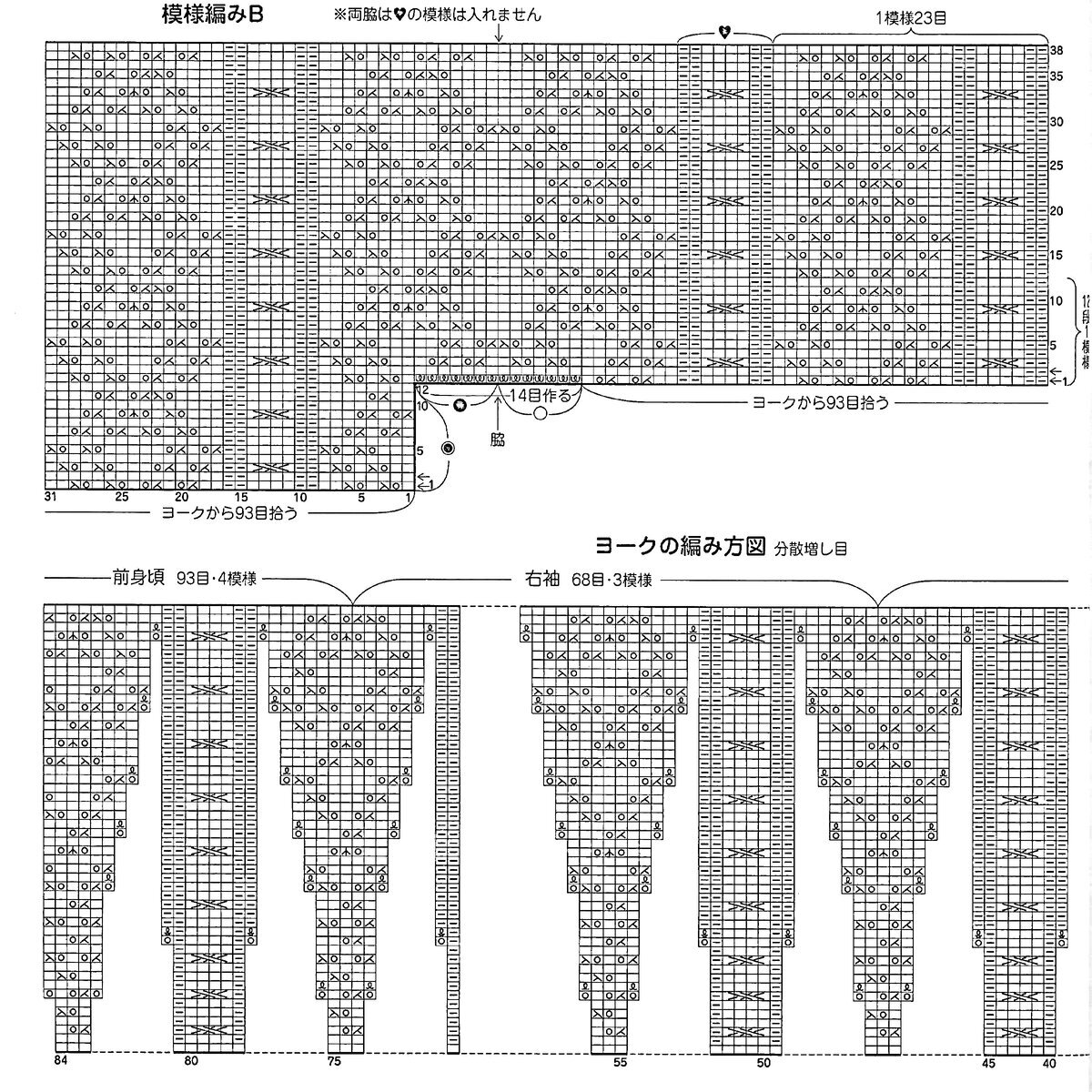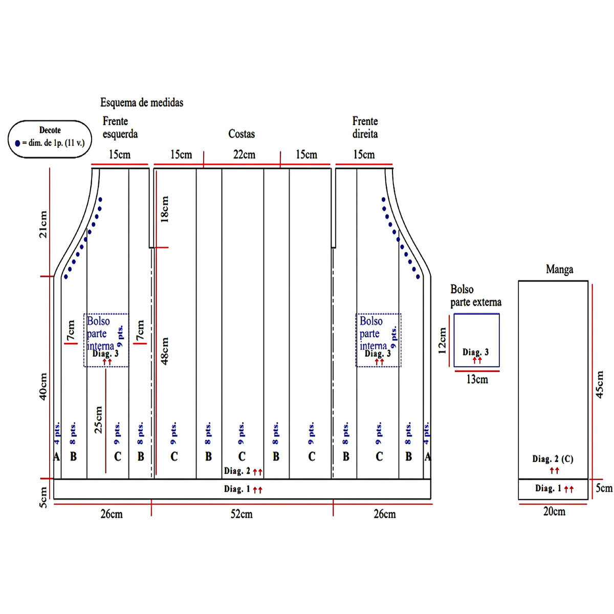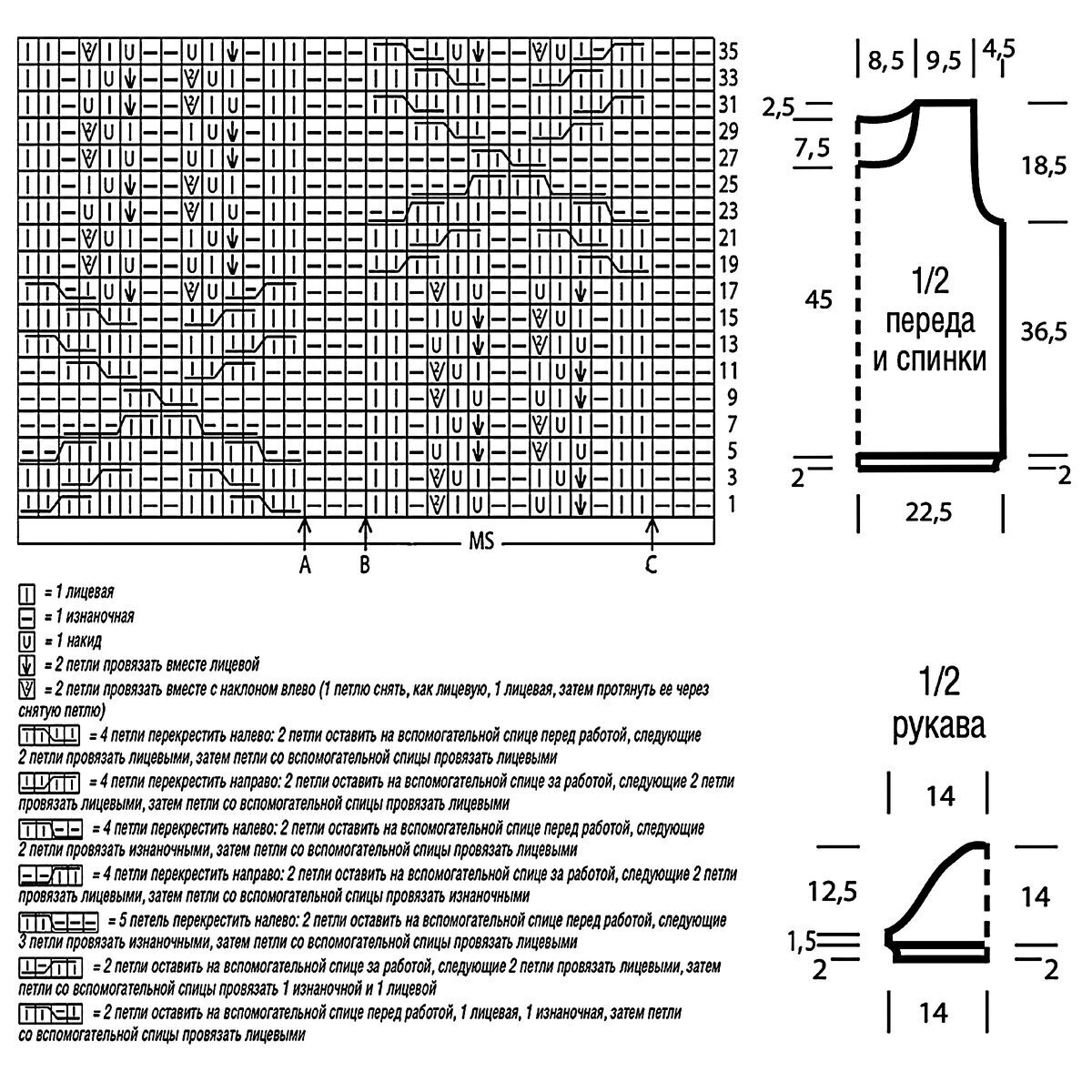 Друзья, будьте внимательны! В оригинальной схеме есть ошибка или, вернее, недочёт — пустой квадрат в условных обозначениях идёт как изнаночная петля, но это обозначение верно не для всей схемы! Если посмотреть внимательно на изделие, то в ажурном узоре с косами пустой квадрат идёт как лицевая петля. Я уточнила этот момент в расшифровке и выделила узор красным (этот же узор идёт на схеме для рукавов и там все пустые квадраты обозначают лицевую петлю).