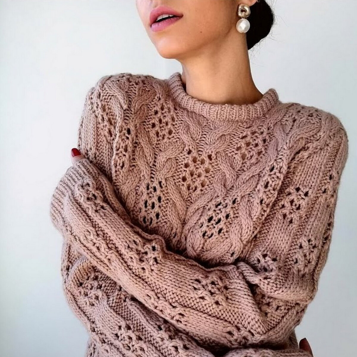 Просторный свитер с объёмными косами и вставками в виде ажурных дорожек — и тепло и нарядно!