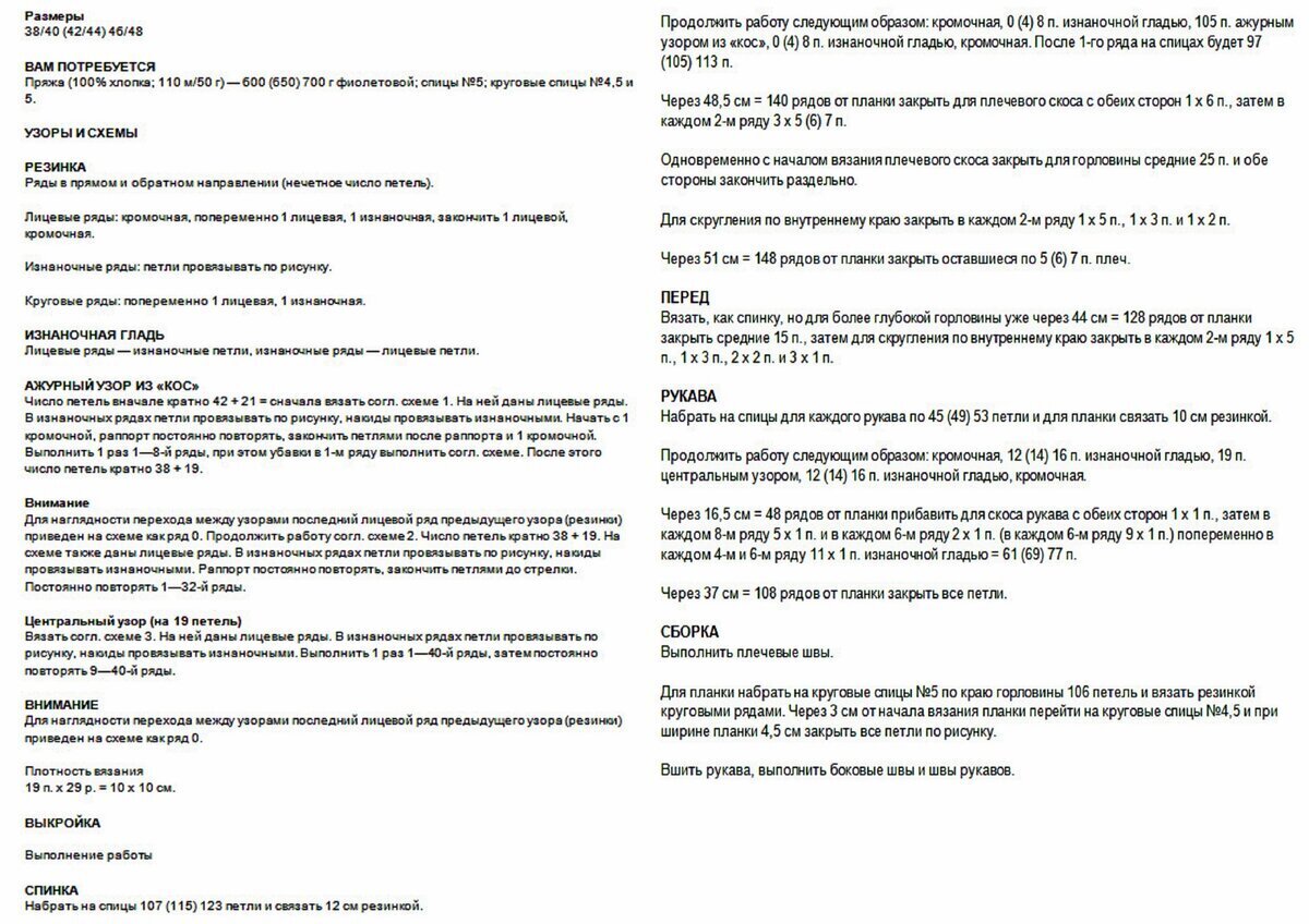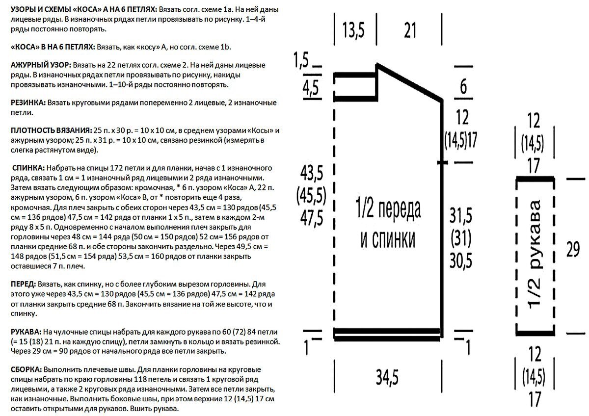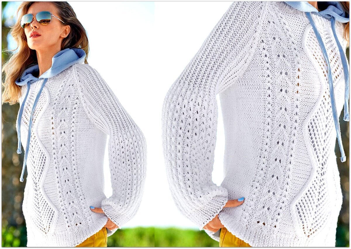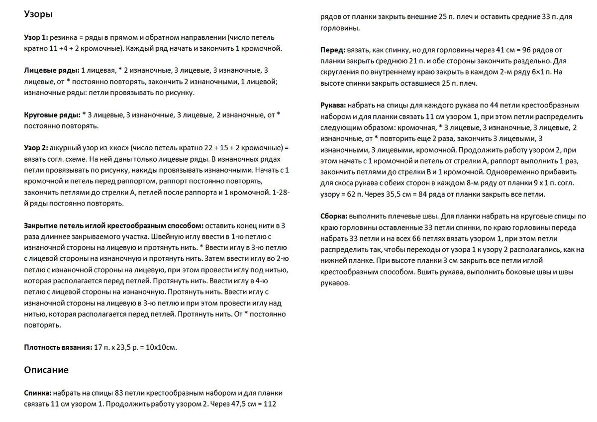 Прямой фасон, спущенный широкий рукав, круглый вырез горловины. Отделка по низу, на манжетах и горловине — резинка 1 х 1. Перед и рукава связаны оригинальным узором — сочетание ажура и объёмных жгутов. Спинка — лицевая гладь (для летнего варианта можно спинку связать так же, как и перед). Длина свитера чуть ниже талии.