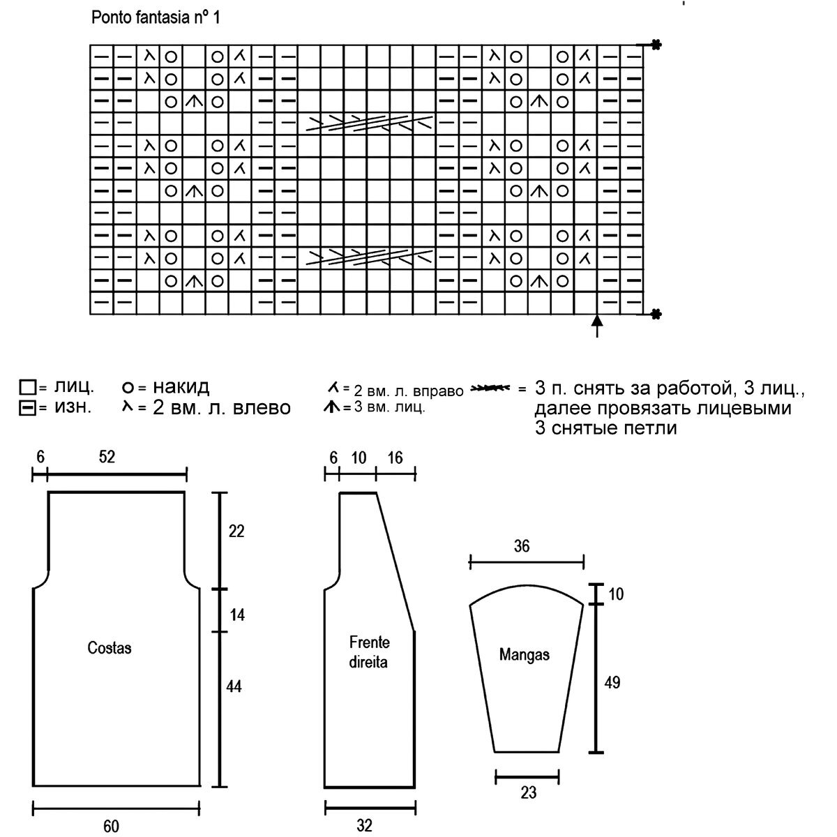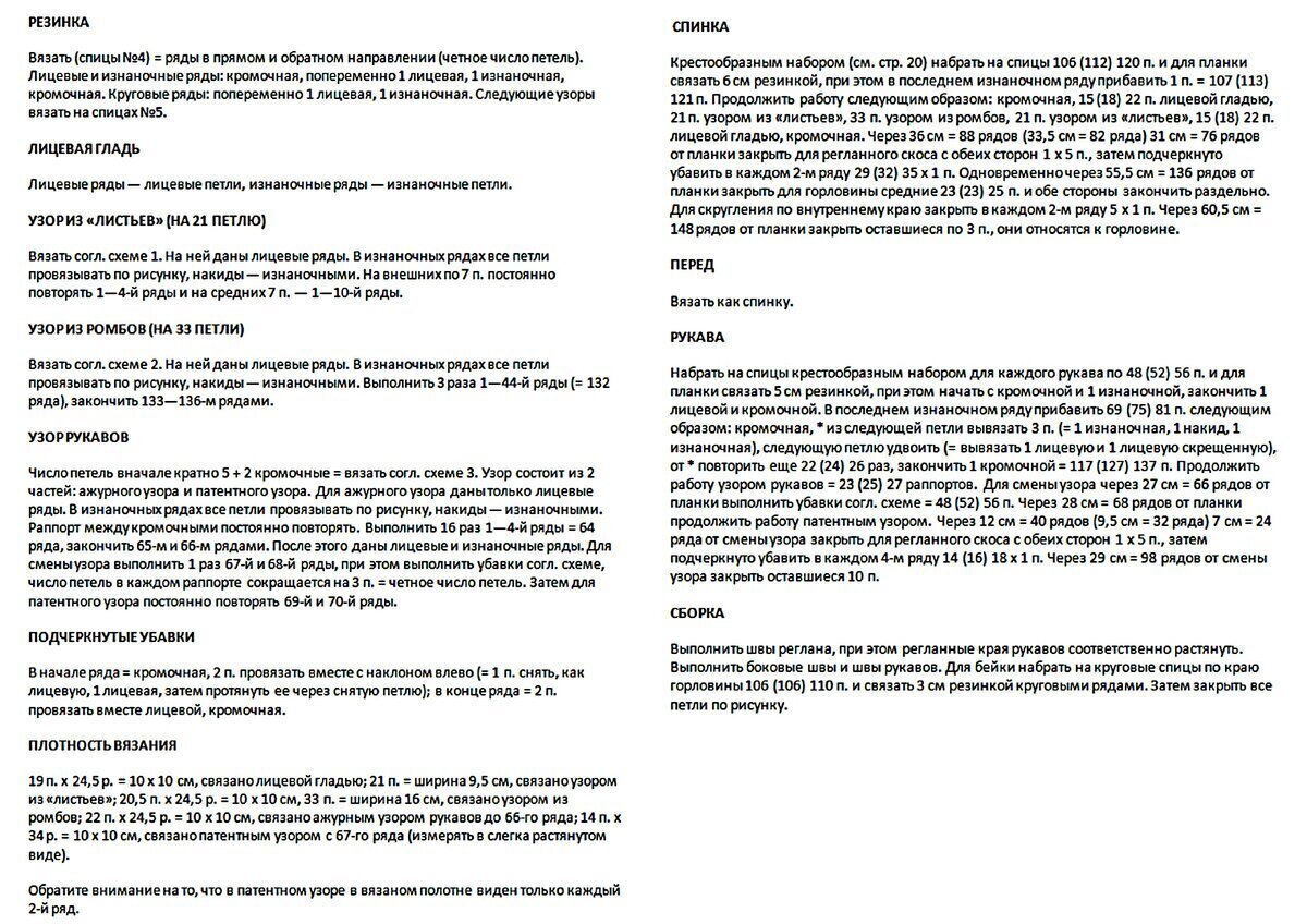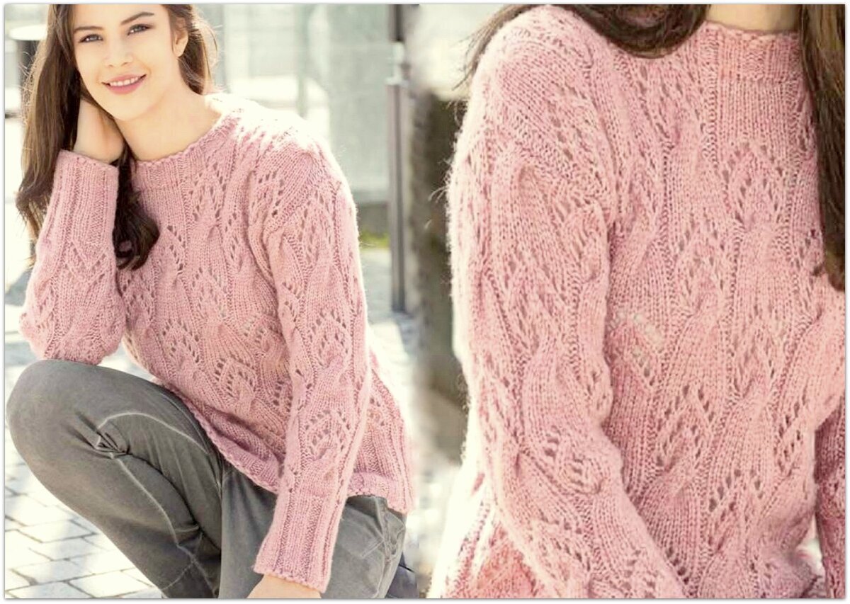 Связать такой джемпер можно как регланом снизу, так и регланом сверху (но имейте в виду, что при вязании сверху листики будут перевёрнутыми — если хотите этого избежать, просто переверните саму схему, начиная с её конца).