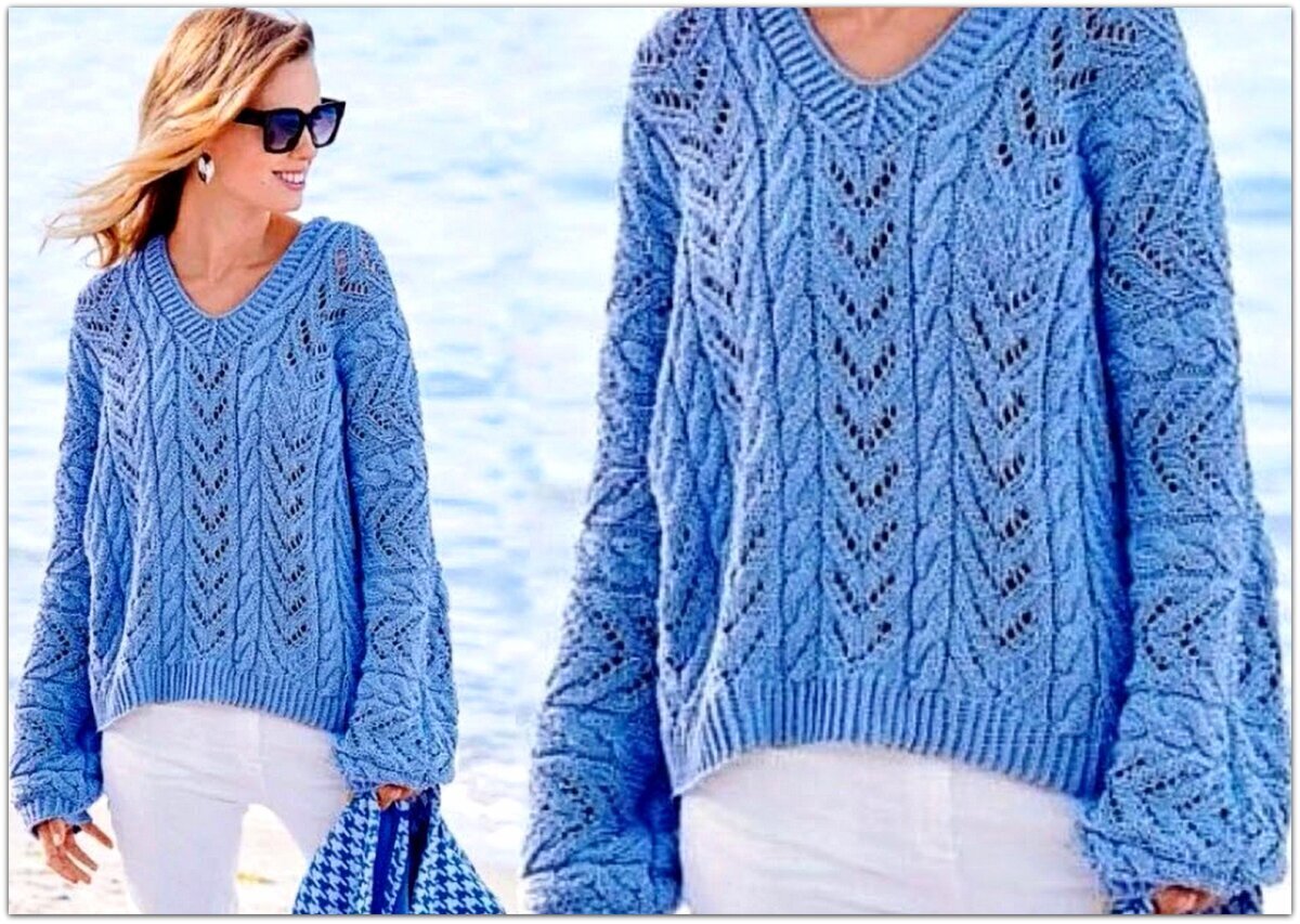 Этот чудесный пуловер примечателен не только приятным небесно-голубым цветом и ажуром с косами, но и оригинальным рукавом — такой рукав вяжется поперёк: нужное количество петель набирается сразу с передом и спинкой.
