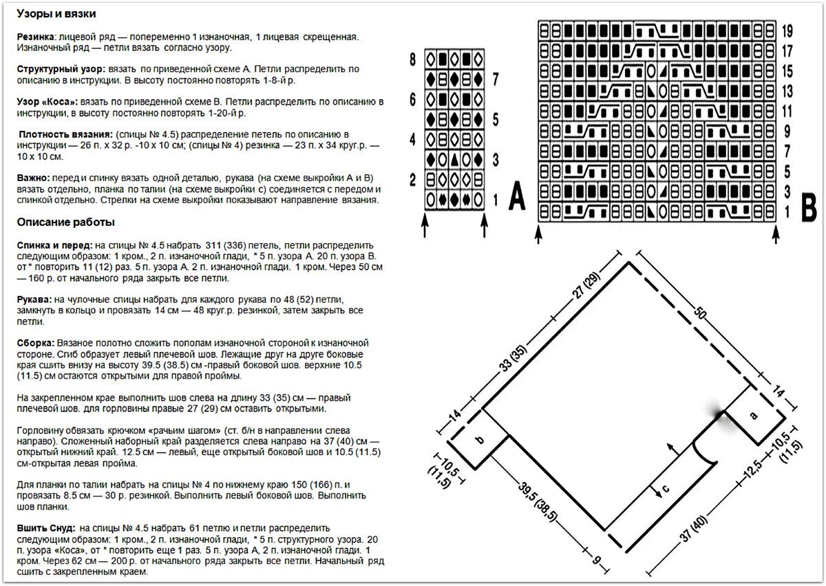 Удлинённый свитер с нескучными узорами из жгутов и ажурных ромбов. Глубокий круглый вырез, широкая резиночка внизу и на манжетах.