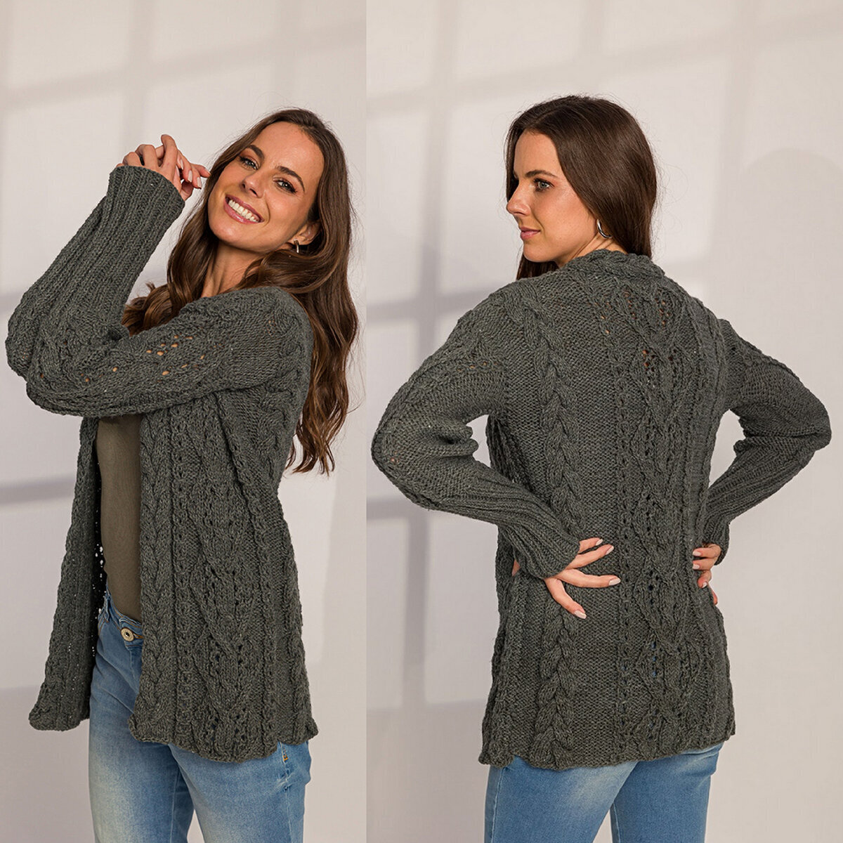 Стильный серый кардиган с длинными рукавами на узкой манжете-резинке. Уютная женская модель, украшенная объёмными косами, аранами и красивыми японскими ажурами (все узнали знаменитый узор «замочек»?).