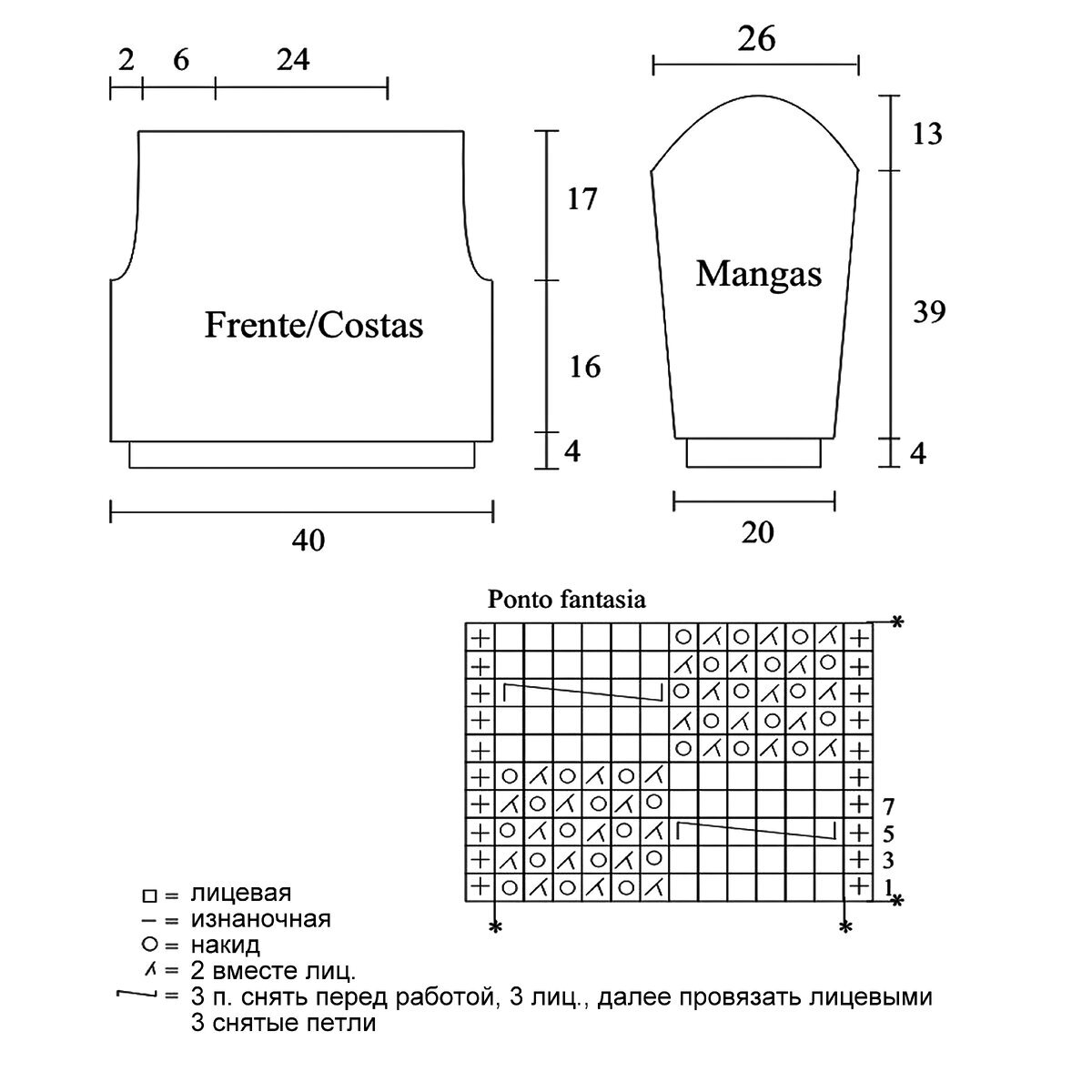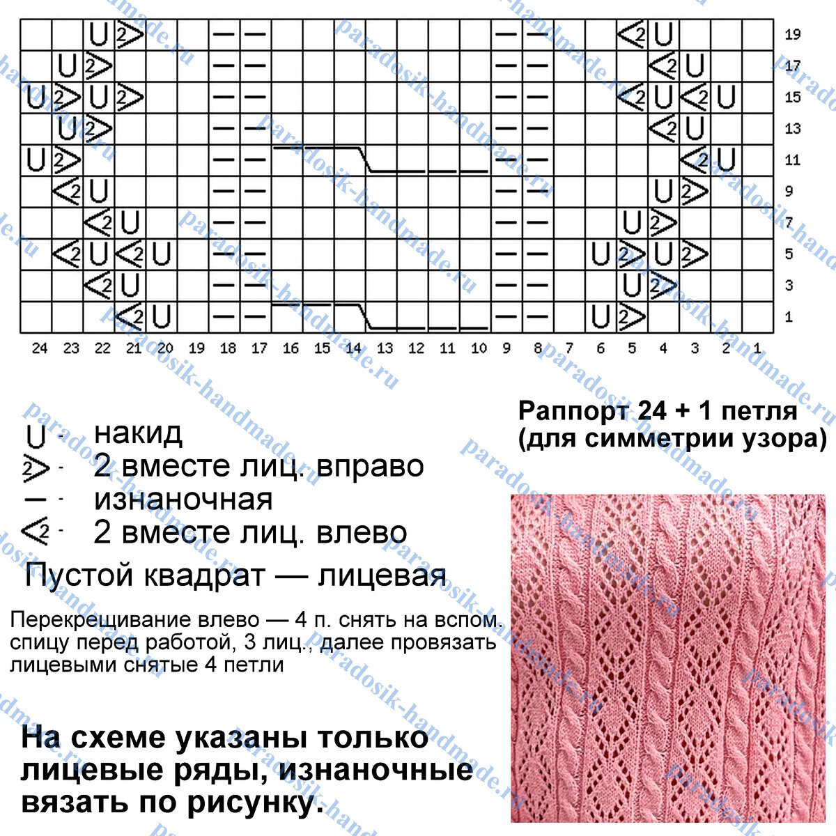Раппорт узора 24 петли и 20 рядов в высоту. На схеме указаны только лицевые (нечётные) ряды, изнаночные (чётные) вязать по рисунку.