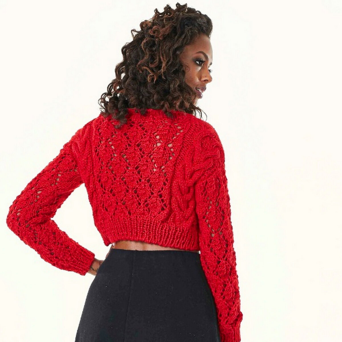 Красный укороченный джемпер с длинными узкими рукавами. Необычное сочетание ажурного узора из крупных ромбов и объёмных кос по краю. Прямой фасон, слегка спущенная линия плеча и вырез лодочкой.
