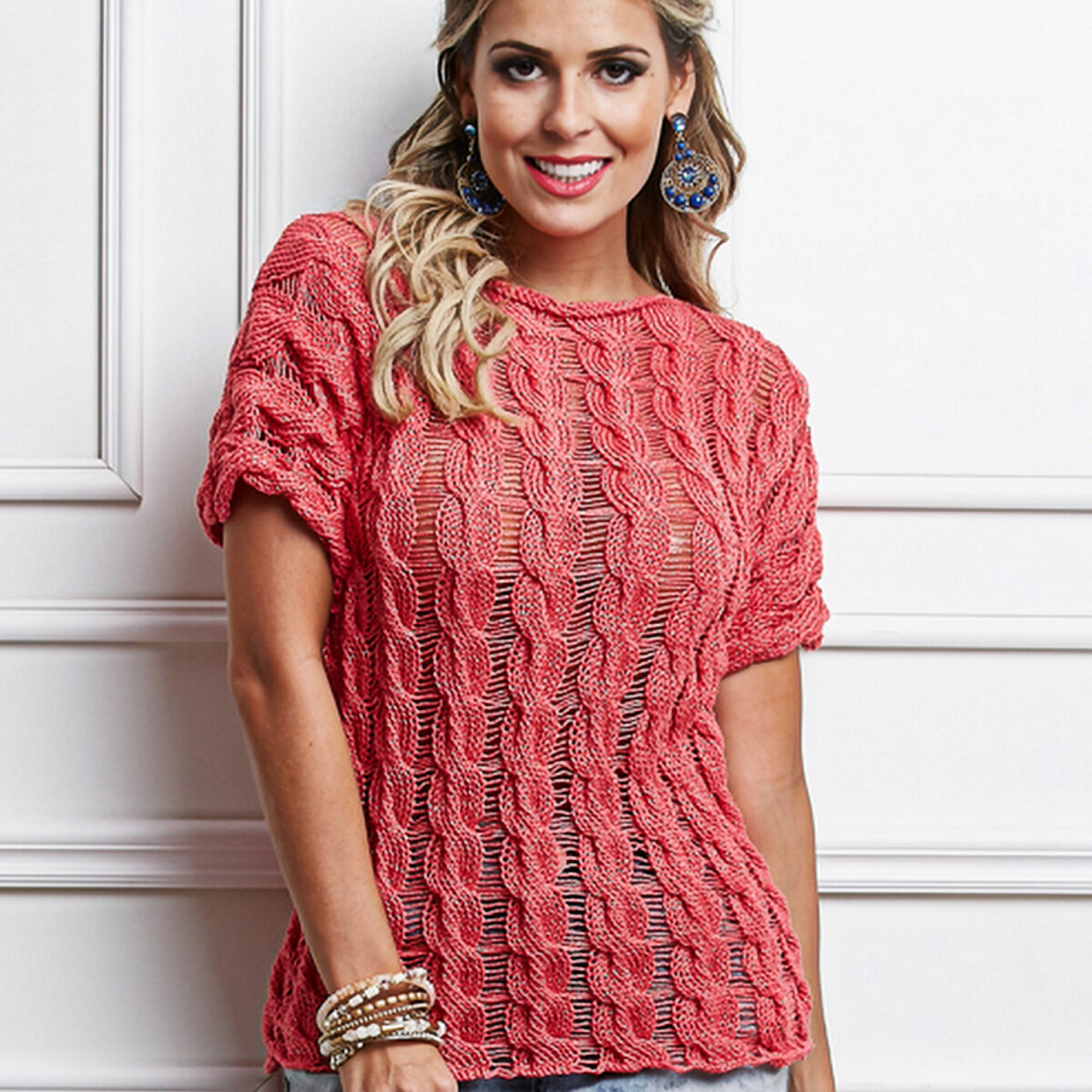 Шикарный коралловый топ с узором из объёмных жгутов и спущенных петель. Модель прямого кроя с небольшими цельными рукавчиками (вяжутся одновременно с передом и спинкой) и вырезом-лодочкой.