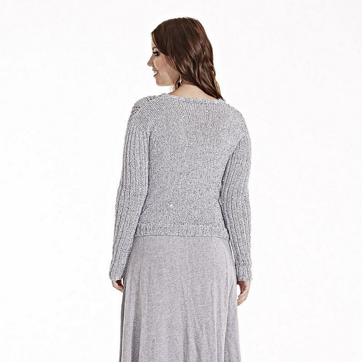 Для вязания нам потребуется 5 мотков — на размер 44-46 — серой пряжи с пайетками: 20% шерсть, 20% хлопок, 60% акрил; 100 гр — 250 м. Спицы № 3,5-4, а также вспомогательная спица для кос.
