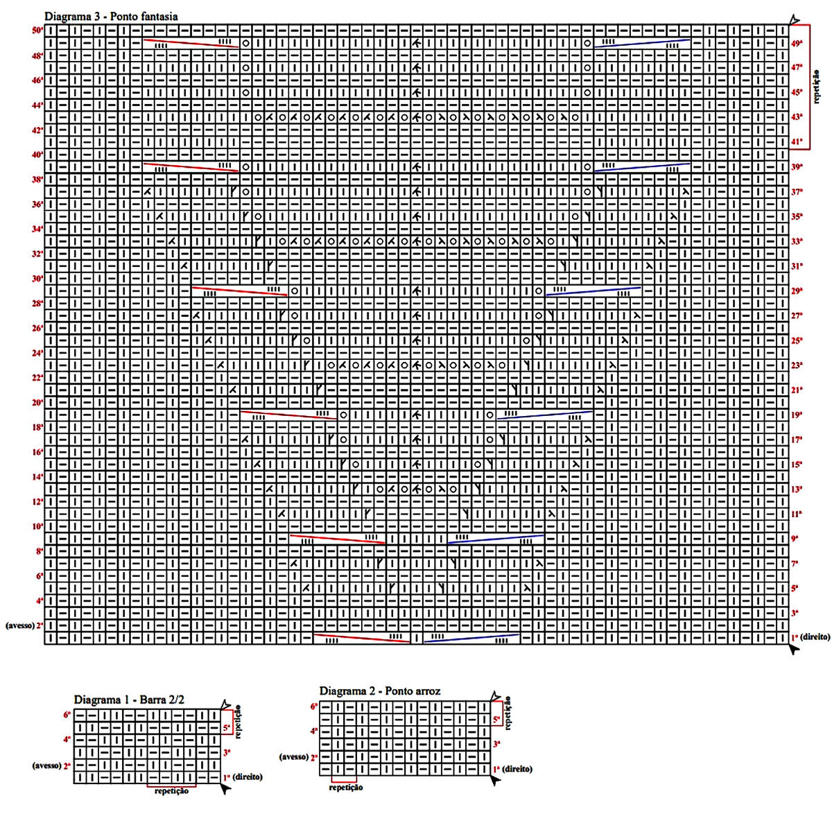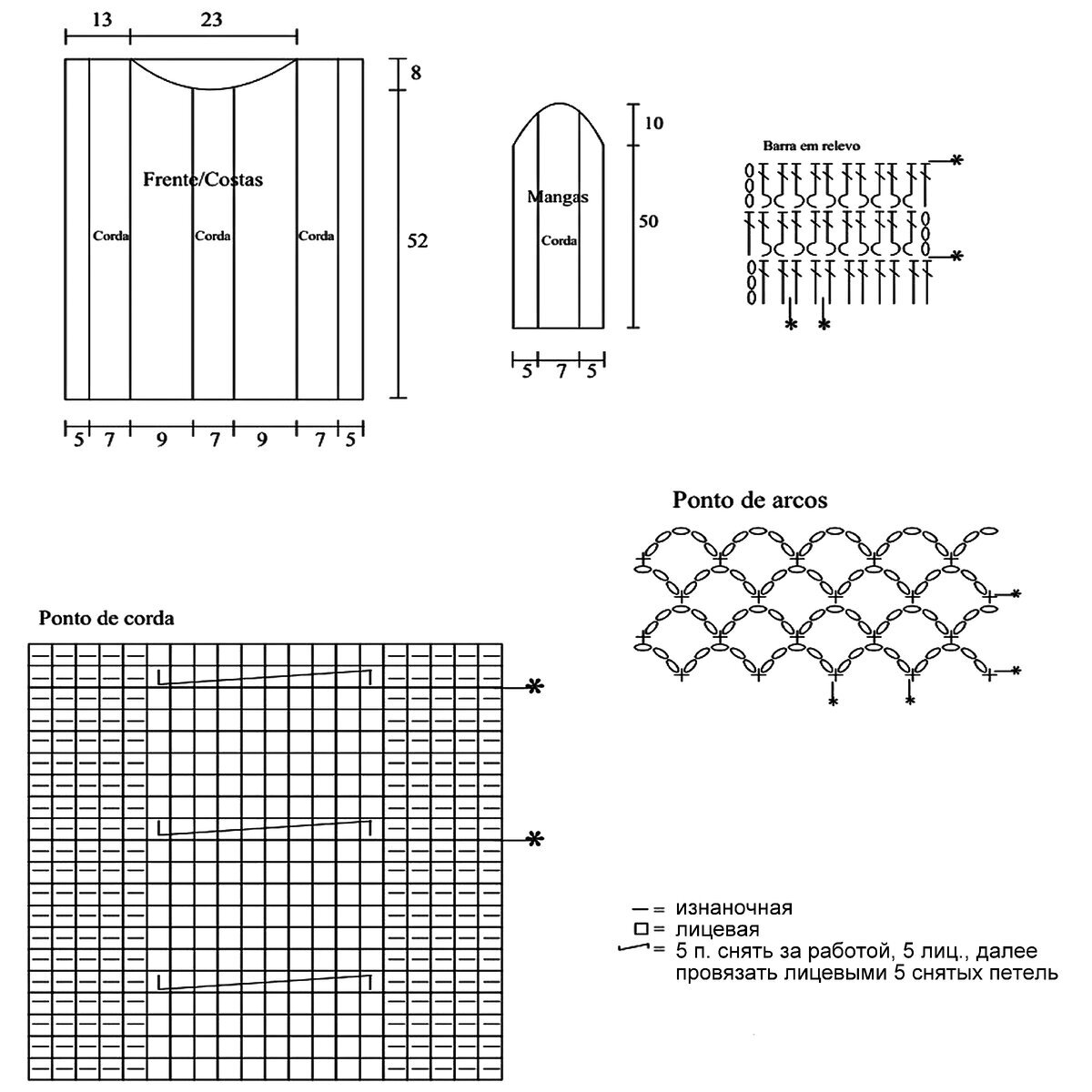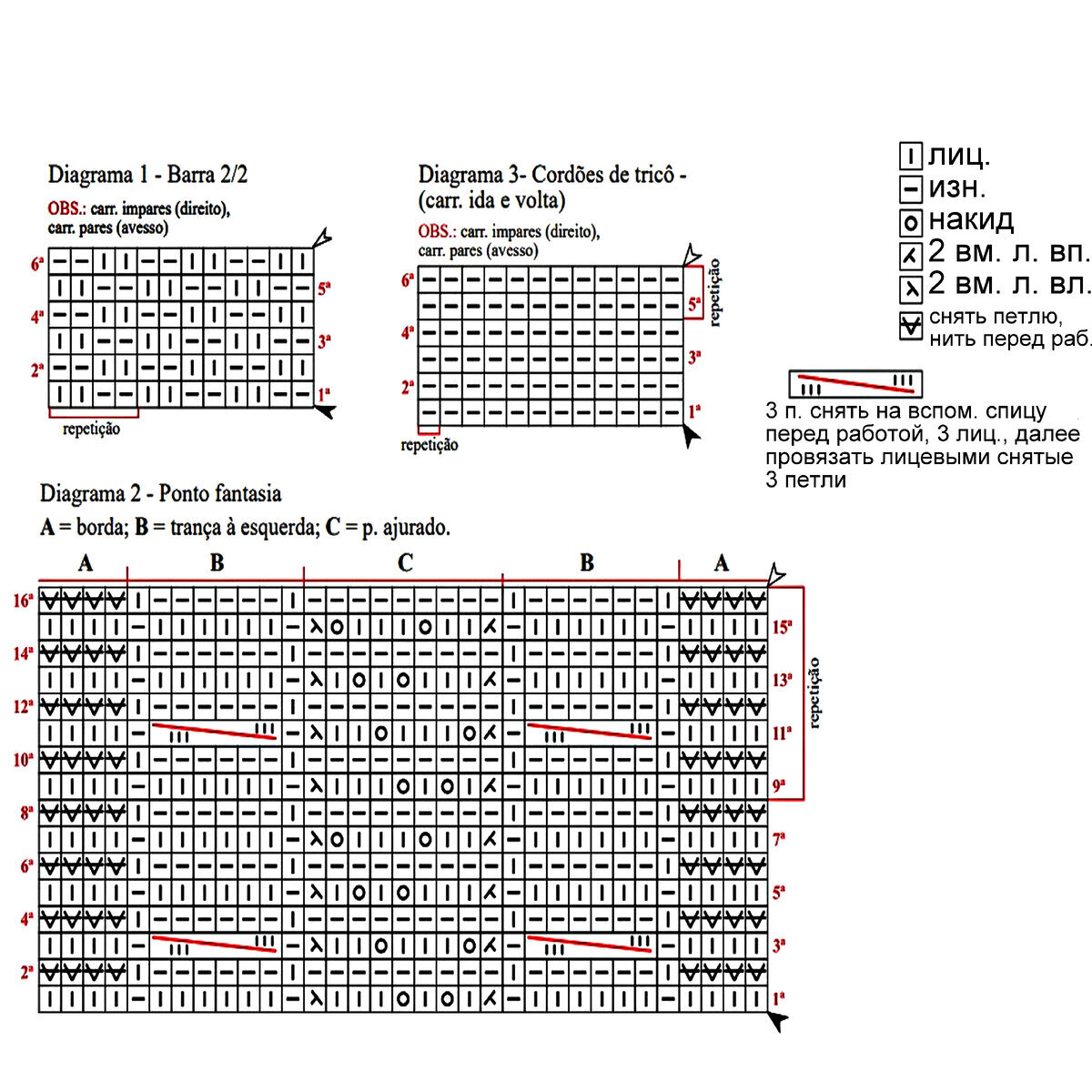 - Основной ажурный узор кардигана, который идёт на спинке и переде — ажурные ромбы, между которыми объёмные жгуты (перекрещивание влево: 4 петли снять на вспомогательную спицу перед работой, далее провязать 3 лицевые, затем лицевыми снятые 4 петли). Раппорт узора 18 петель и 22 ряда в высоту. На схеме указаны только лицевые (нечётные) ряды, изнаночные (чётные) вязать по рисунку.