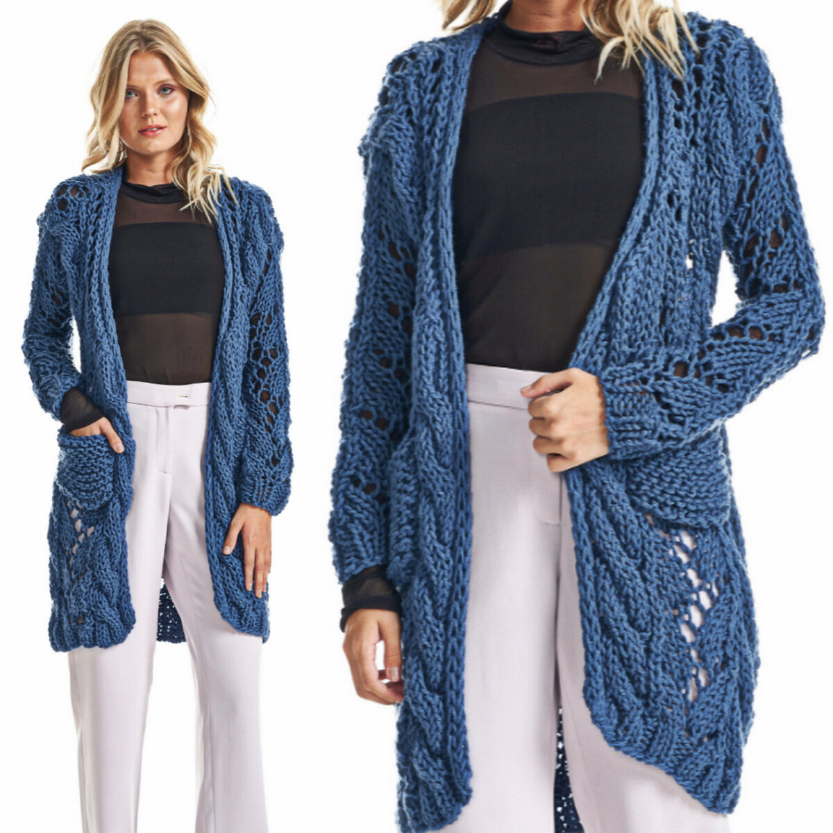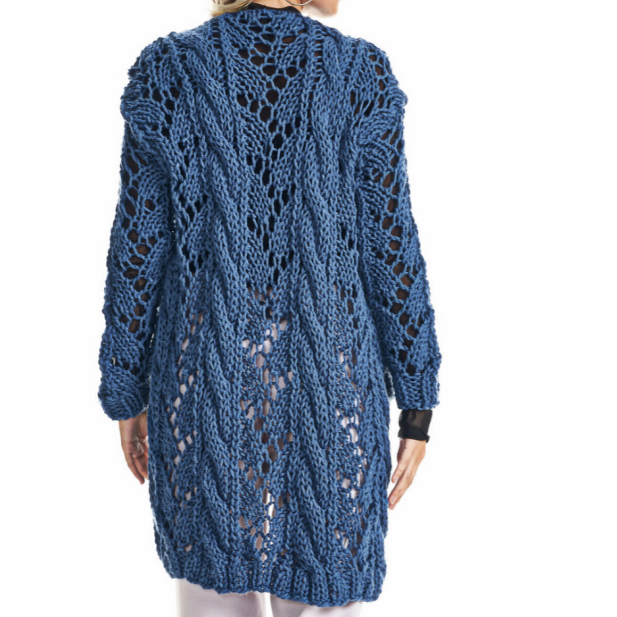 Синий кардиган оверсайз крупной вязки. Классическое сочетание несложного ажура и объёмных жгутов. Прямой удлинённый фасон, спущенная линия плеча и симпатичные кармашки.