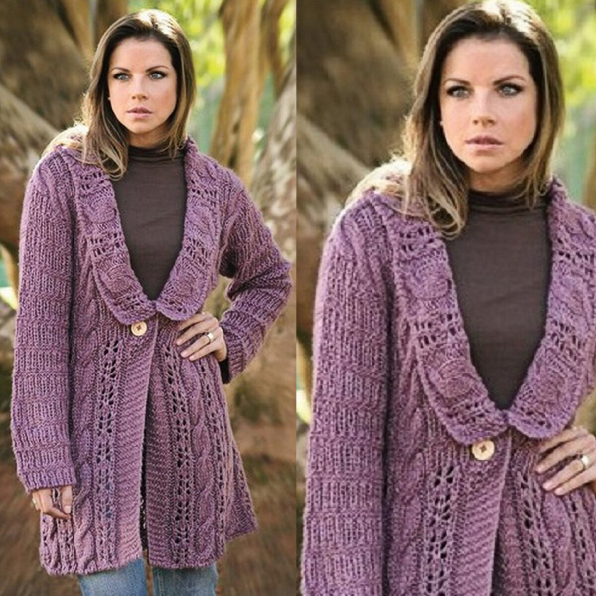 Длинный сливовый кардиган с большим отложным воротом, застёгивающийся на одну крупную пуговицу.