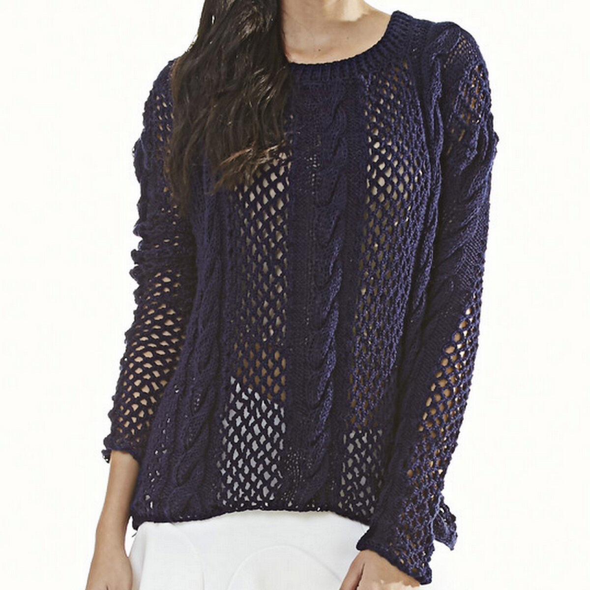 Этот тёмно-синий джемпер — интересная комбинированная модель: полосы с объёмными косами спицами чередуются с крупной сеткой крючком. Обратите внимание, что полосы с косами вяжутся вертикально, а сетка крючком надвязывается уже после по готовым полосам поперёк, одновременно соединяя их в единое полотно. Прямой фасон до бедер, длинный рукав-труба и круглый вырез горловины.