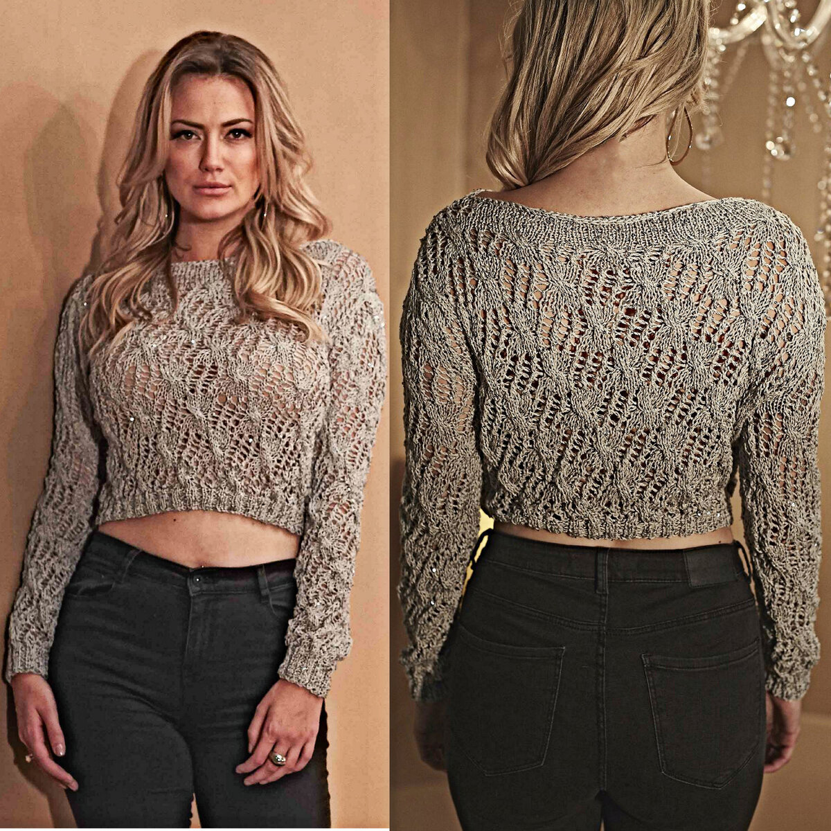 Укороченный серый джемпер из мягкой пряжи с мелкими пайетками. Прямой фасон чуть выше талии, длинные узкие рукава и вырез лодочкой.