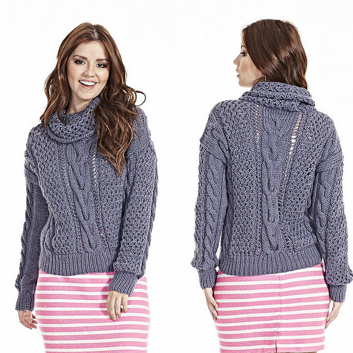 Интересная асимметричная модель, но привлекла она меня, в первую очередь, своим необычным воротником-хомутом на фоне оголённого плечика — сразу стало любопытно, что же здесь за выкройка. Оказалось, что это не воротник, а просто снуд, который вяжется отдельно и потом пришивается к краю. Отличная идея — связать ажурный асимметричный джемпер и к нему небольшой снуд-хомут. Я бы даже пришивать не стала, чтобы можно было носить и со снудом, и без него.