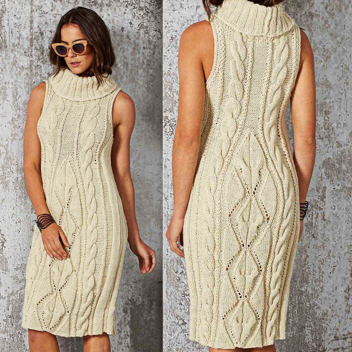 Платье-безрукавка с широким воротом-хомутом натурально-белого цвета. Стильная модель, которую можно носить в качестве тёплого сарафана поверх тонкой блузочки, например. Объёмные и мелкие жгуты по бокам и рельефный лиственный узор в центре.