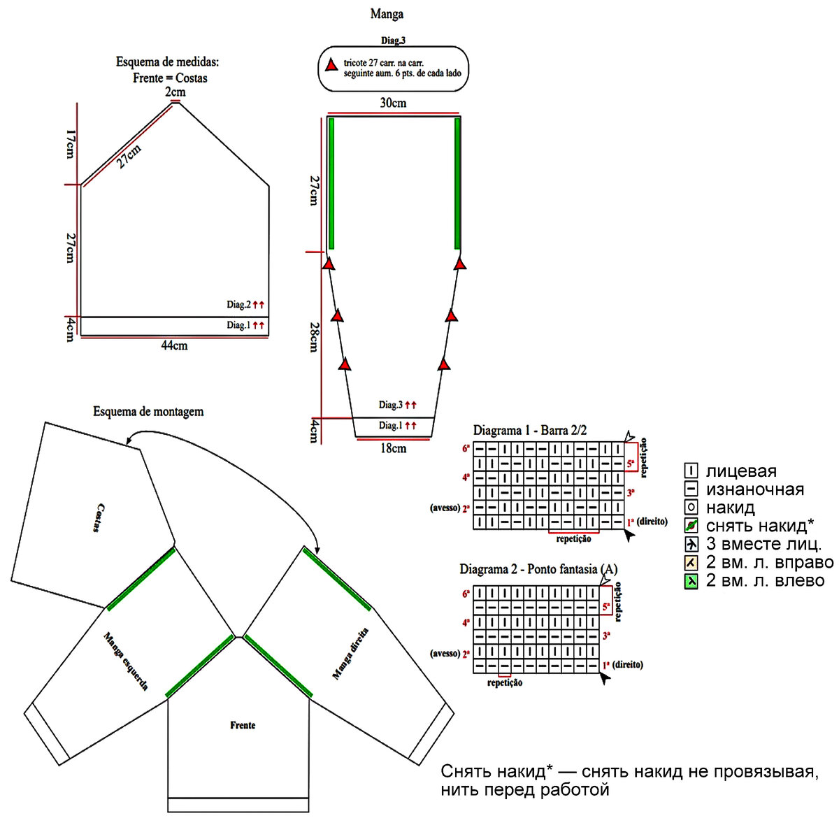 Фасон очень простой, справится даже новичок: вяжем обычный прямоугольник, без убавлений под проймы, только V-образный вырез. Далее рукава (набираем петли по краю или же вяжем отдельно и затем сшиваем). Затем набираем петли впереди по вырезу горловины, оставив небольшие отрезки по бокам, далее набираем петли набросом нити на спицу (заранее рассчитайте, какой высоты вам нужны лямочки) и затем так же набираем петли по вырезу сзади, оставив отрезки для плечиков. Вяжем наши лямочки, и одновременно отделку горловины, по кругу.